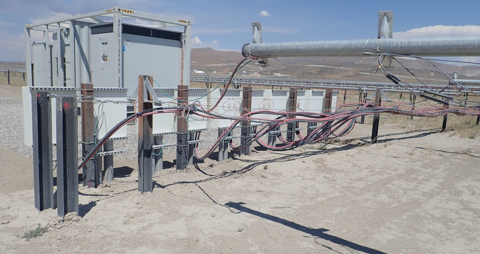 The back side shows just how much adjustment is in this mechanism as well (where it mounts to the I-beam), and the main control module. There’s an emergency stop button, a solar panel for tracking, and some cable glands. No idea what’s in there, or if it has some batteries or capacitors to handle really dark days in the winter. I’d like to think that the “central smarts” would have units park in a sane position if fog or heavy clouds are expected (as where you point the modules doesn’t matter on those days), or perhaps that’s enough panel to run the motor slowly on really dark days. No idea! I will say that the maximum angle here should be more than sufficient to rapidly shed snow, if pointing east.