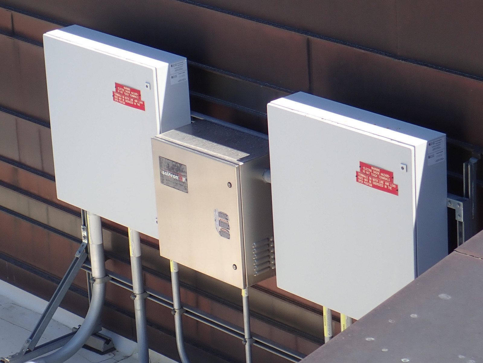 Some junction boxes, with familiar looking labels, feed into a Solaron… something. I don’t know exactly what it is, but you can see here that unistrut hasn’t changed as a preferred mounting system in the last decade! This may be a rapid shutdown system - the labels are consistent with a disconnect, but I don’t see any manual actuation handles on these boxes.