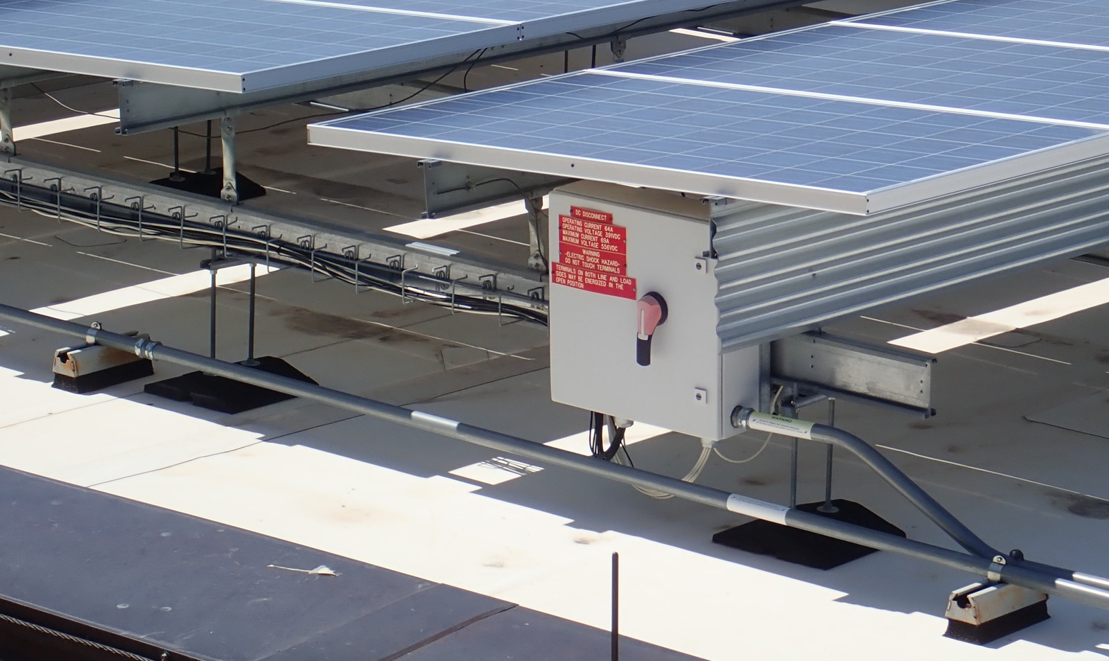 A row of big DC disconnects. Nice fat conduits head down into the ground, with the conduit secured into the lower unistrut rail.