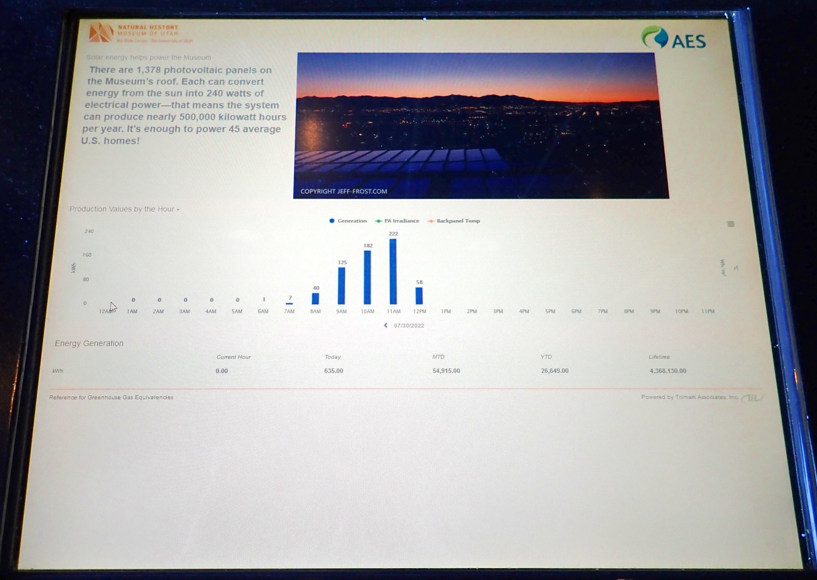 I will, however, point out that 1378 panels does divide evenly into 106 strings of 13 panels… and doesn’t divide into 11 or 12 panel strings evenly. It works out to about a 330kW nameplate system install, and with 457,500 kWh/yr generation, that works out to 1.38 kWh/W. This is only 5% higher than my home system’s 1.31 kWh/W number (the A-frames are not great on a per-watt production basis but make for very long solar days), so I have to assume there’s some regular shading from the mountains nearby. South facing panels should produce a good bit more. But even this is only 25% or so of the museum’s annual consumption - so they’re using ~1800 MWh/yr for that building. Whoof. And not an EV charger in sight.