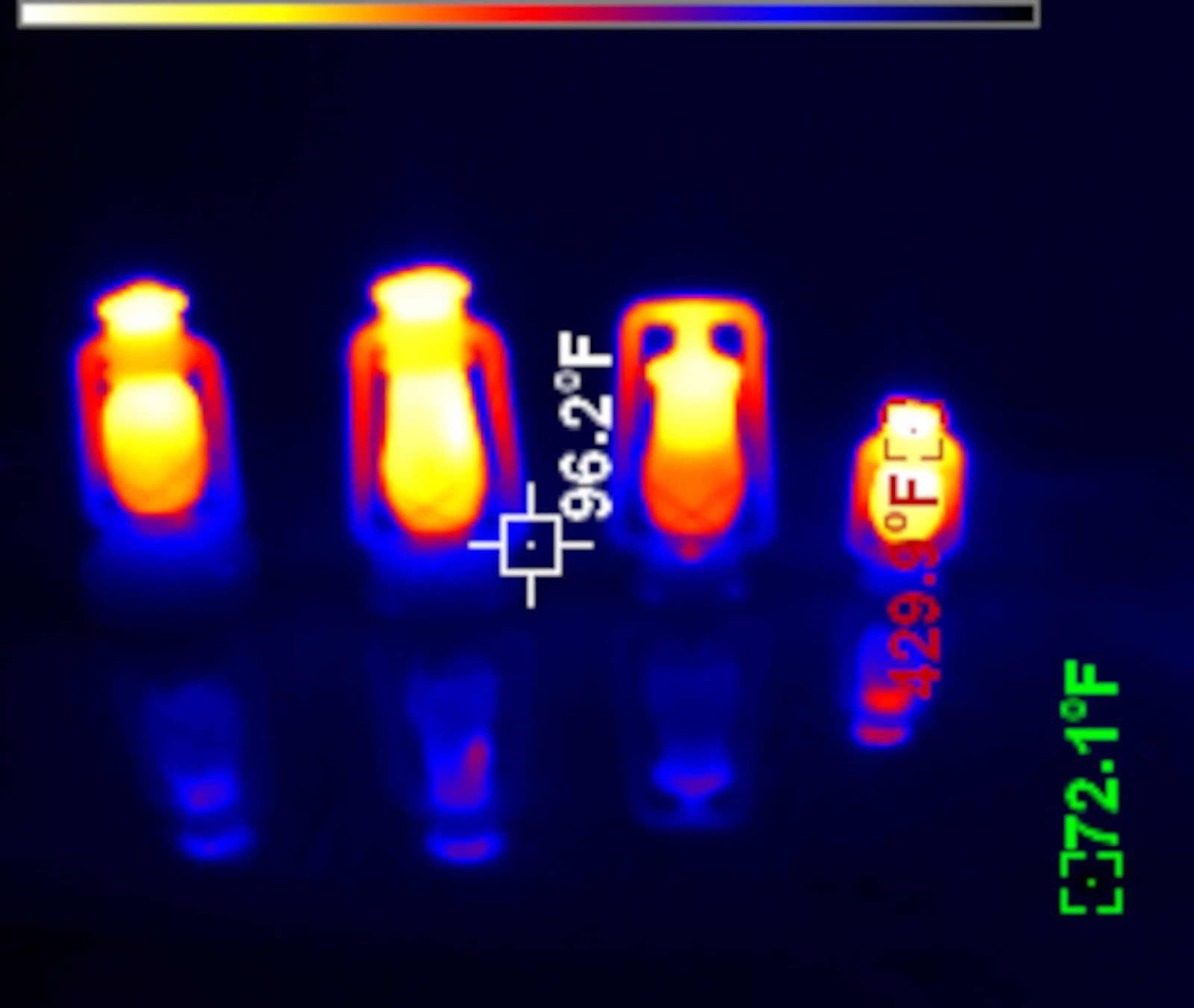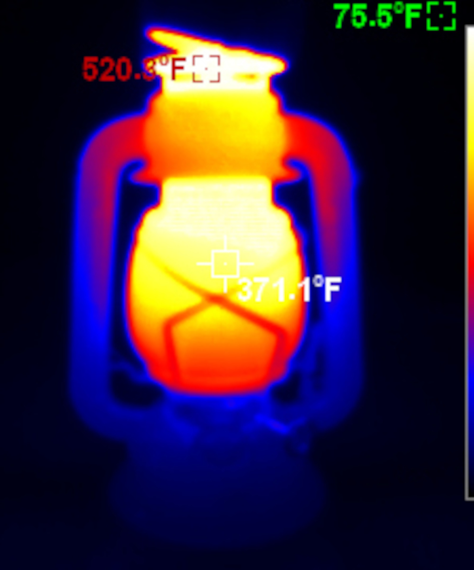 A characteristic of the hot blast lanterns, with their recirculating combustion products, is a cooler flame - and it shows here in the temperature at the top. Cranked up, the top of this lantern is 30-40 degrees cooler than the others, and it runs cooler yet at a normal flame height.