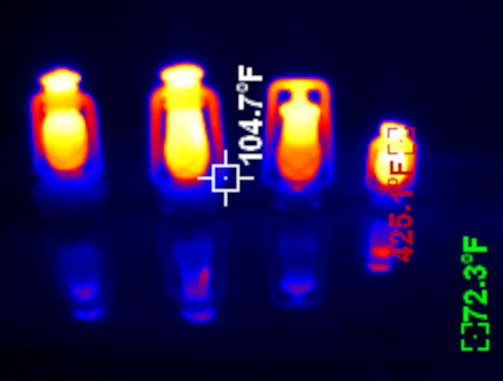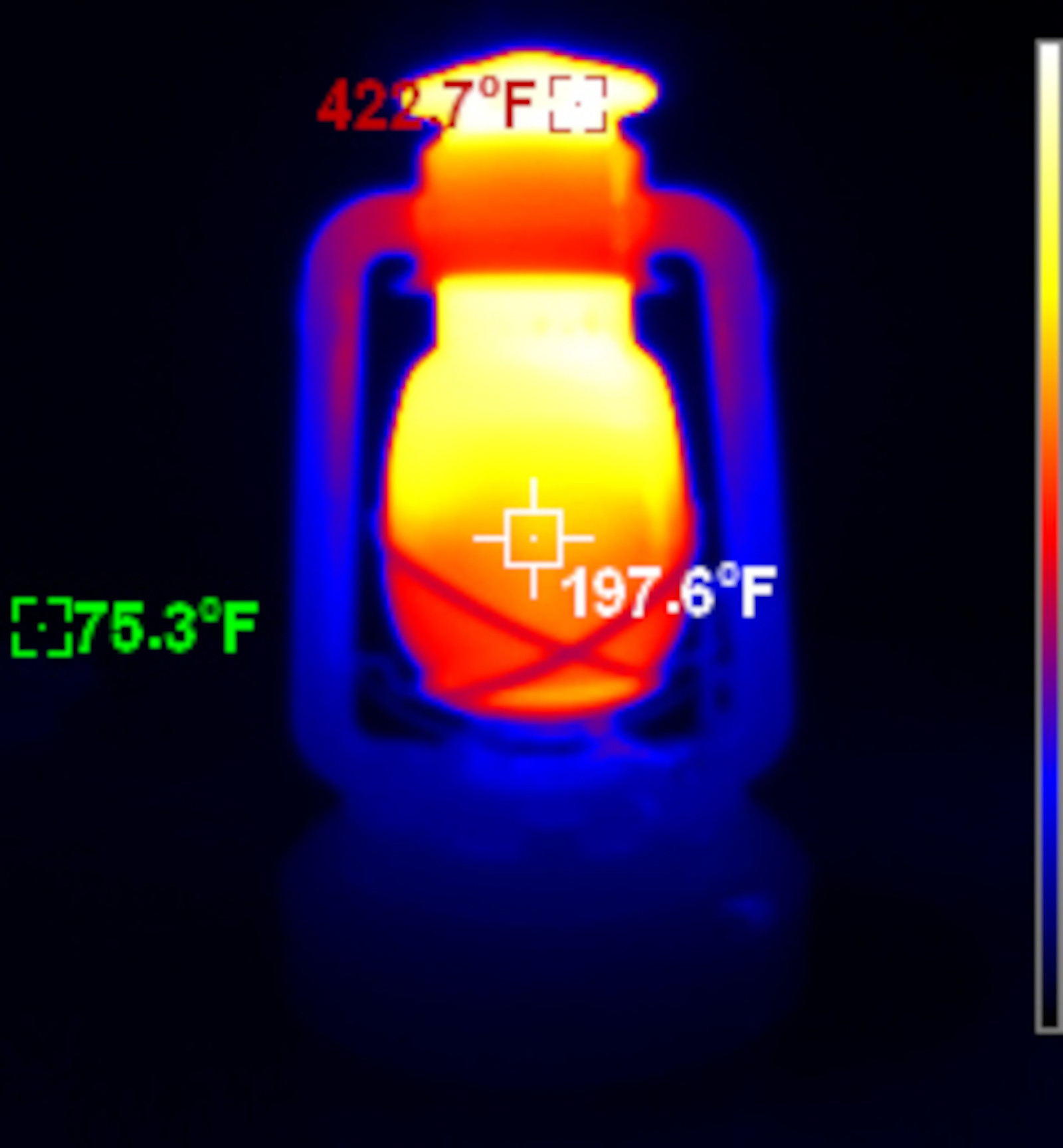 Finally, the Comet. There’s been some discussion about why the Comet will char the paint at the top of the chimney with a plastic smell and the other lanterns don’t. I’ll offer this as an answer: Because it runs 100F hotter than the rest, with what looks like cheaper paint. The top of this lantern is up at 520F under full flame - and the reasons are clear. The flame extends almost to the top of the globe with the Comet. But even on a small lantern, running flat out, the font remains cool.