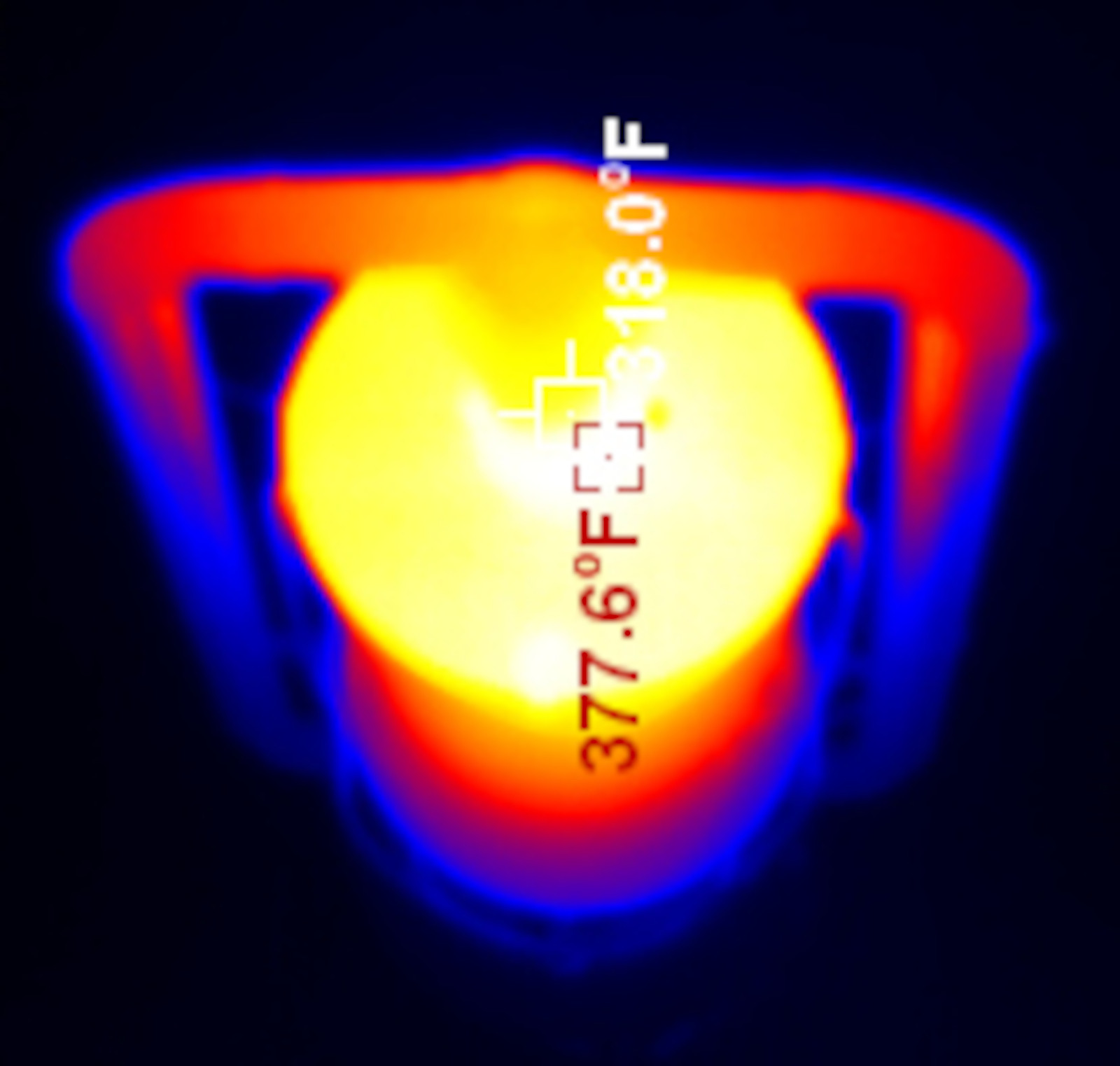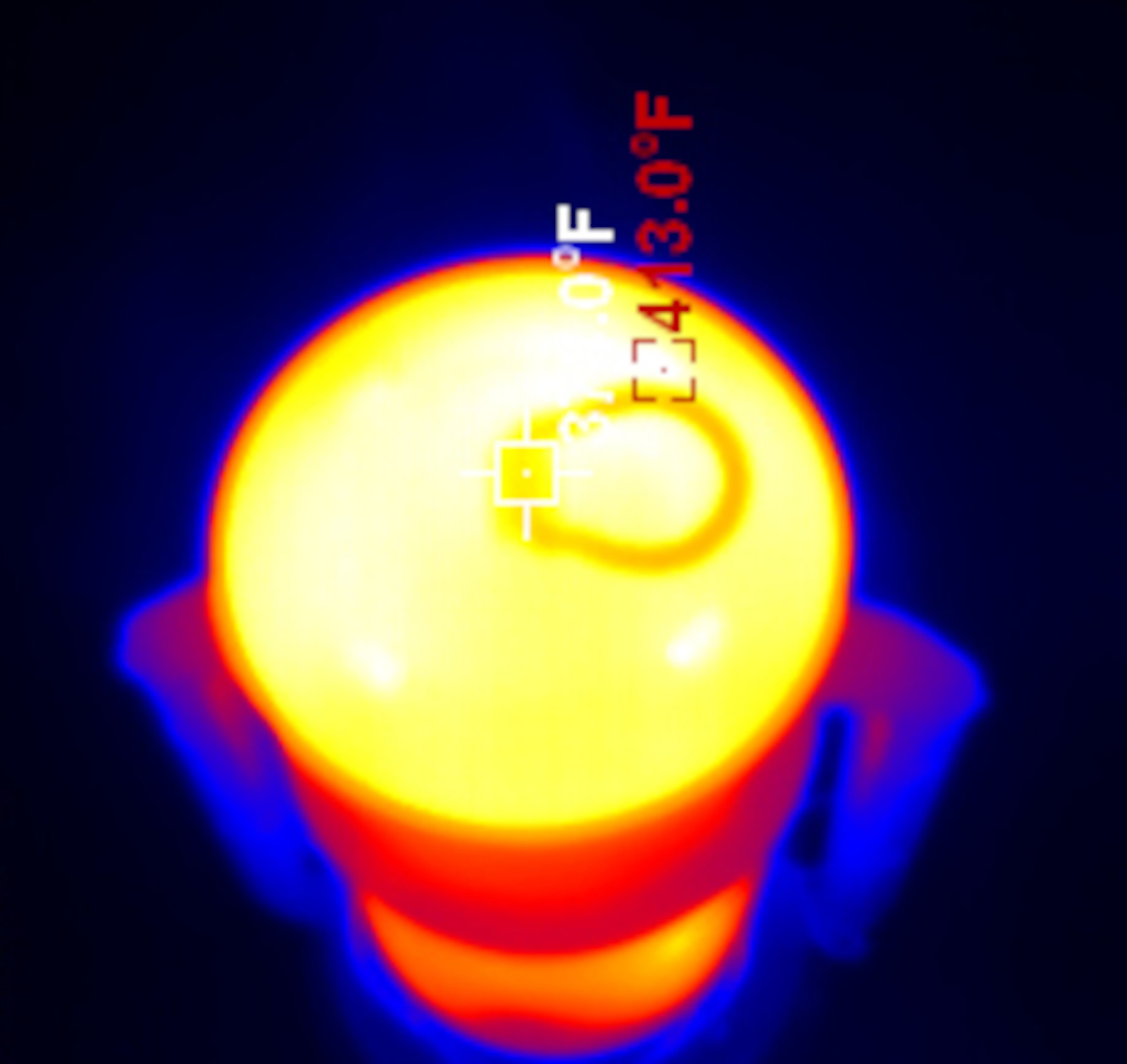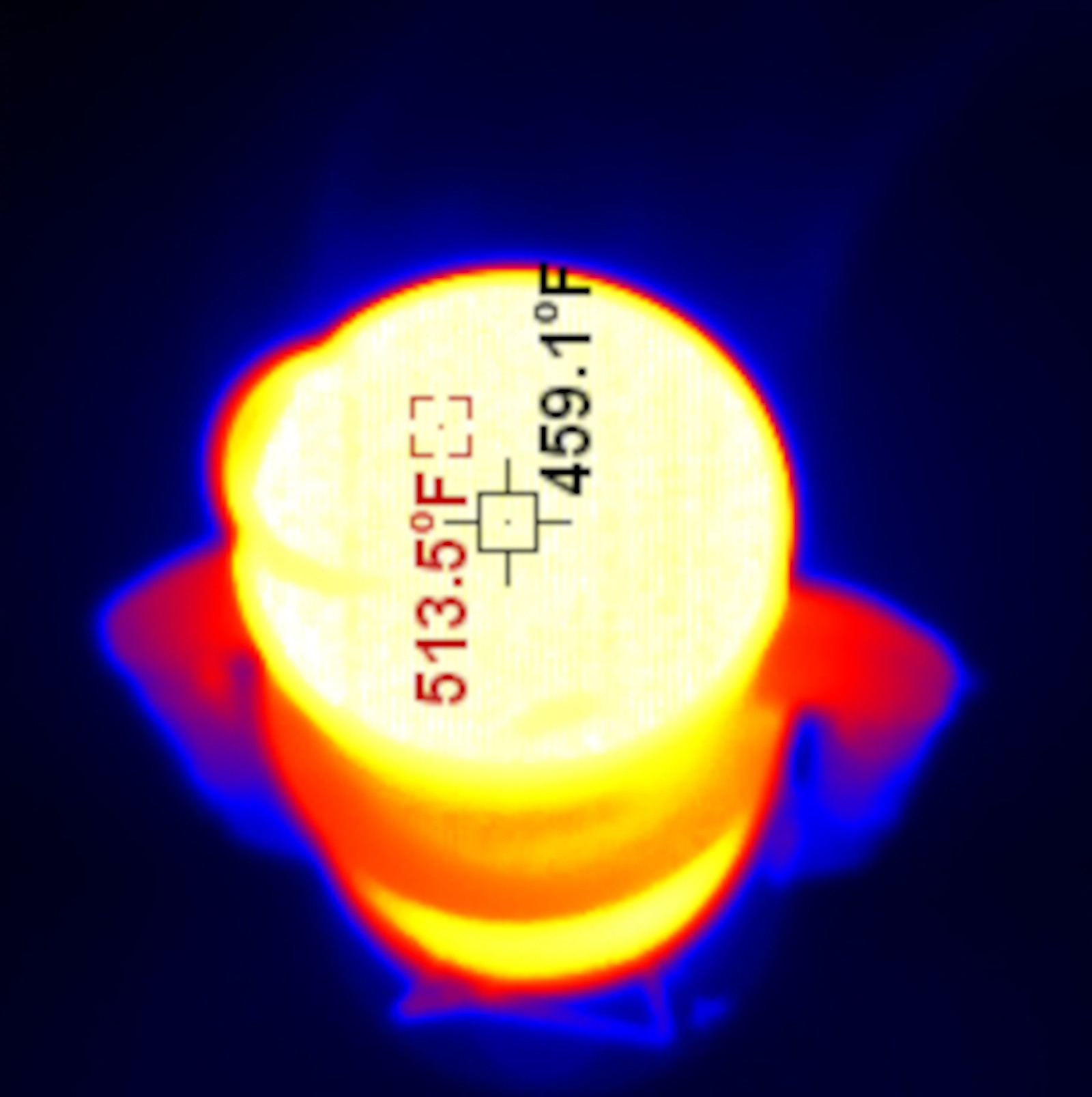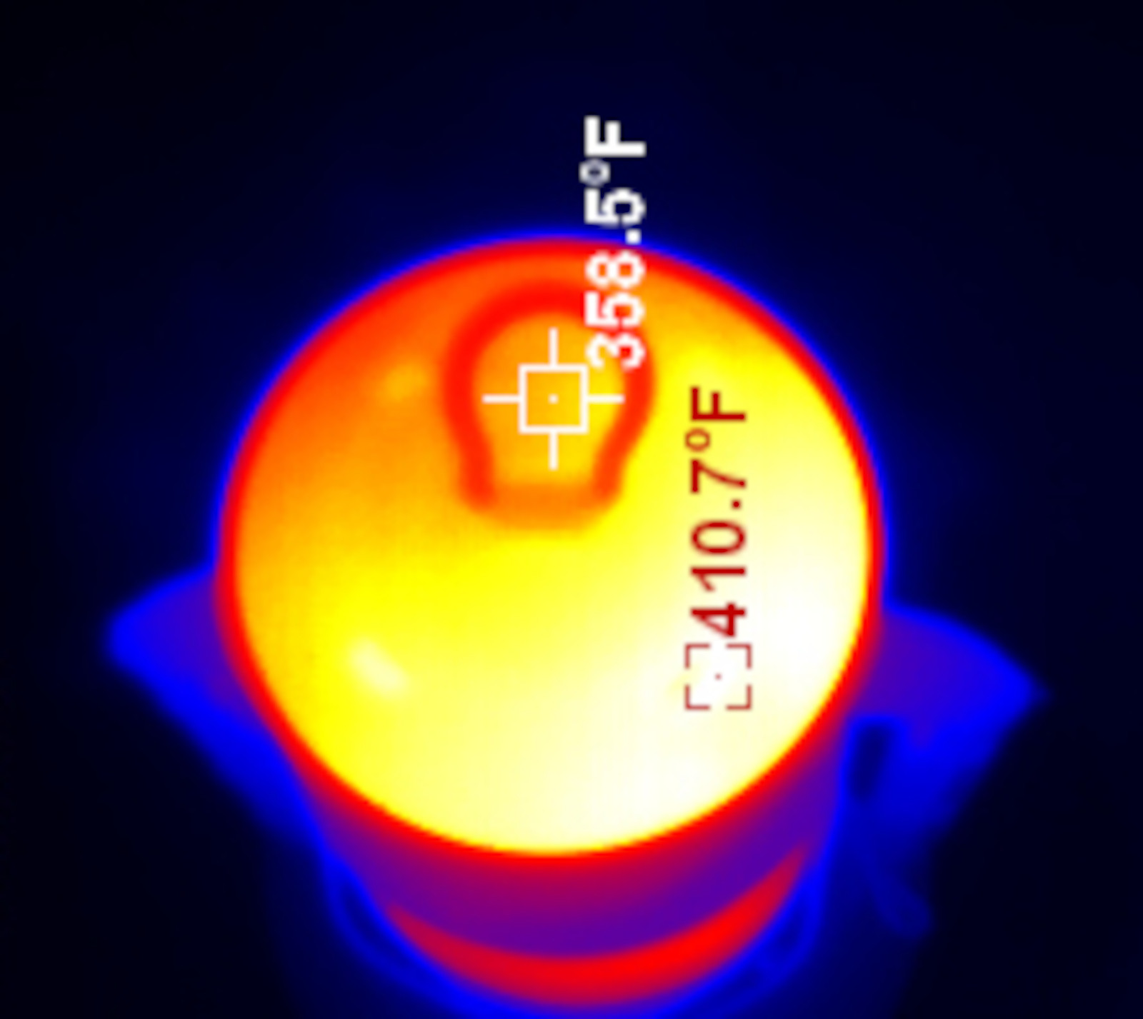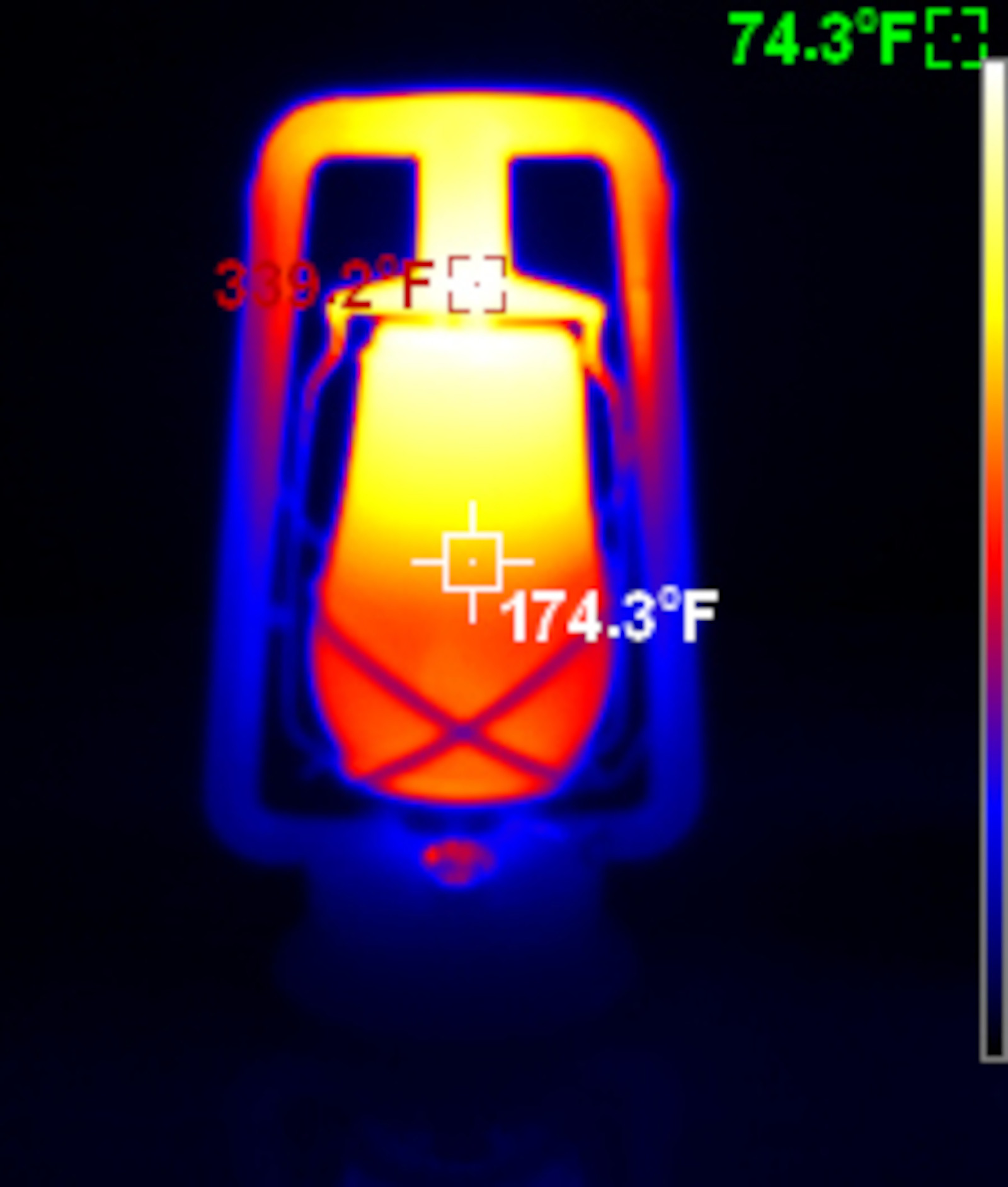 The Jupiter is on the large side of cold blast lanterns, and shows the same general pattern one sees in all of them. The globe is hot (I left emissivity at 0.95 so it’s probably not 100% accurate here, but I assure you, the globe gets hot in operation), the “chimney stack” in the center is hot, the top is very hot, and the tubes down the side are reasonably cool. You can move the lantern by them, though you should probably use the actual bail across the top for even lifting. It’s also worth mentioning that the fuel font is quite cool - barely warmer than ambient down at the bottom. Running properly, you don’t get a lot of heat into the fuel.