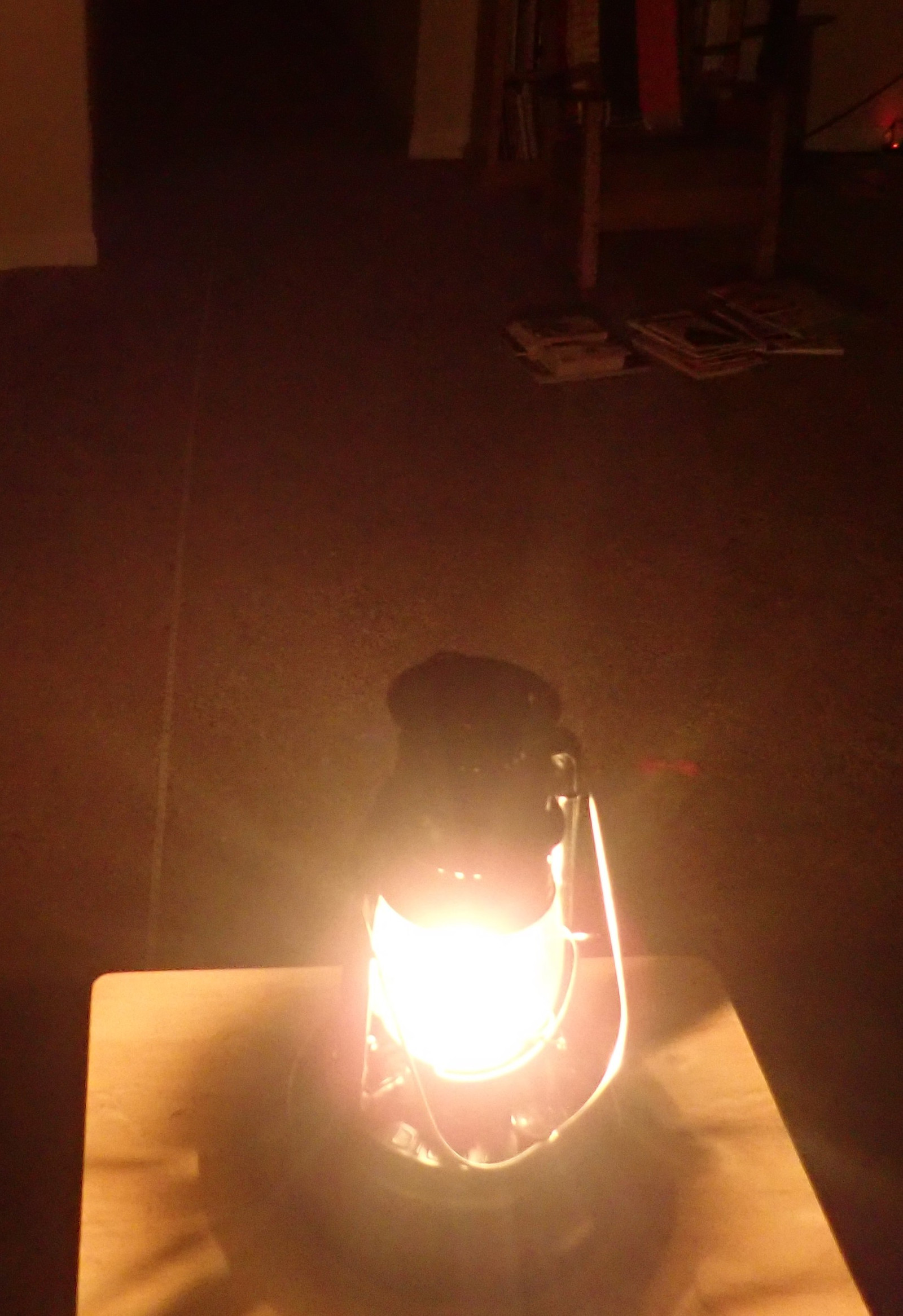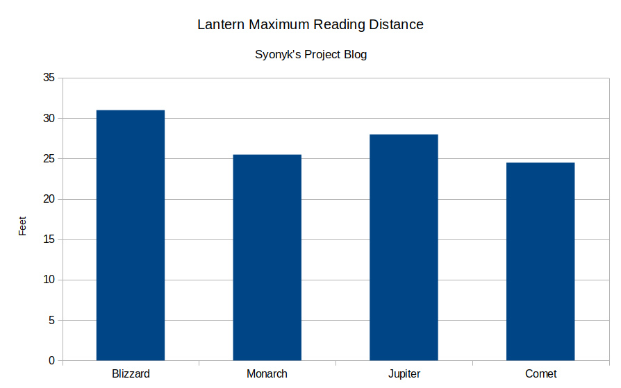 My testing rig is simple enough: One lantern, burning at “maximum sustained brightness,” on a table in an otherwise dark house (without the moon shining in). Walk away from it until the text is just barely readable. Measure distance. It’s somewhat subjective, and I don’t expect your eyes to match mine, but I’ve used two different test subjects and averaged the results.
