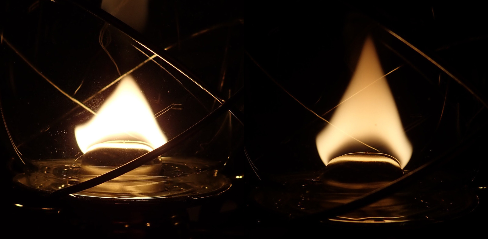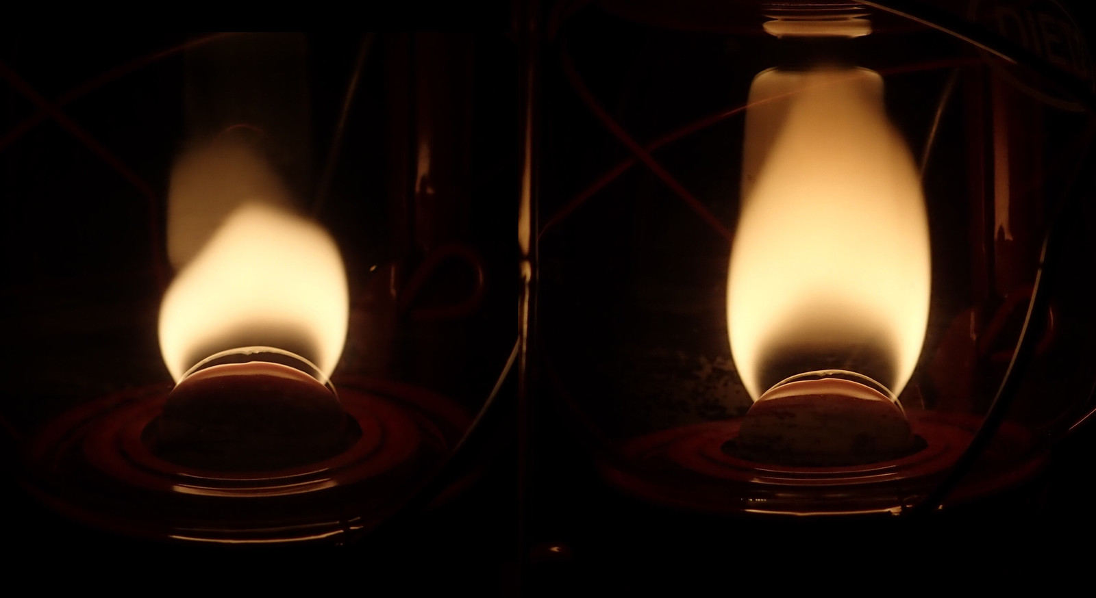 These shots are from the “high flame” fuel burn test - about 75F inside, and the flames as high as I could reasonably get them without the lanterns smoking too badly. This represents something of an upper and on the temperatures one is likely to see on the lanterns, with “normal running temperatures” of a sane flame being somewhat lower.