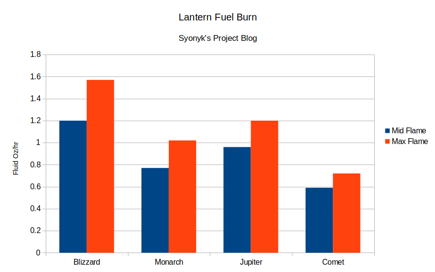 Just how much fuel do these lanterns burn in various flame states? It’s useful to know - but also somewhat hard to find more than the generic data from the spec sheets, all of which seem to have broadly similar number ranges. I have a decent scale, so I’ve set out to generate something closer to “real data from my lanterns.” I’m doing my tests at the same two settings I used above - “medium flame height,” and “running as hard as possible without smoking.” The tests are simple enough: I weigh the lantern, burn it with the specified flame setting for about 3 hours, and weight it afterwards. Kerosene has a specific gravity of around 0.78-0.82 g/cm^3 (0.81-0.85 oz/US fluid ounce), so I can do the math and generate some decently solid oz/hr measurements for fuel. If you’d like to convert these to heat, kerosene has 1050 BTU/fluid oz (135,000 BTU/gal). I’m not a science lab, so don’t treat my measurements as insanely high precision, but they should get you at least close with how the various lanterns consume fuel and emit heat. Despite having the same wick size, the Blizzard and Jupiter definitely consume fuel differently, and I’m happy to claim the tall globe makes the difference.