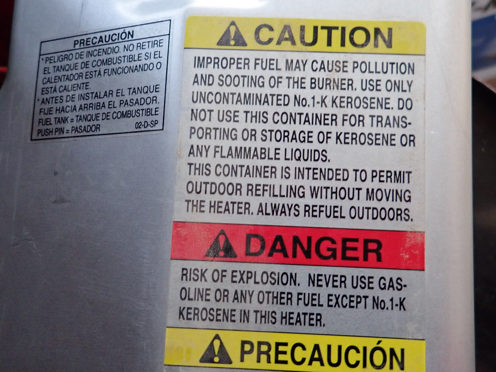 And on the other side, more warnings. Seriously, do not fill a kerosene heater with gasoline. Get the point?