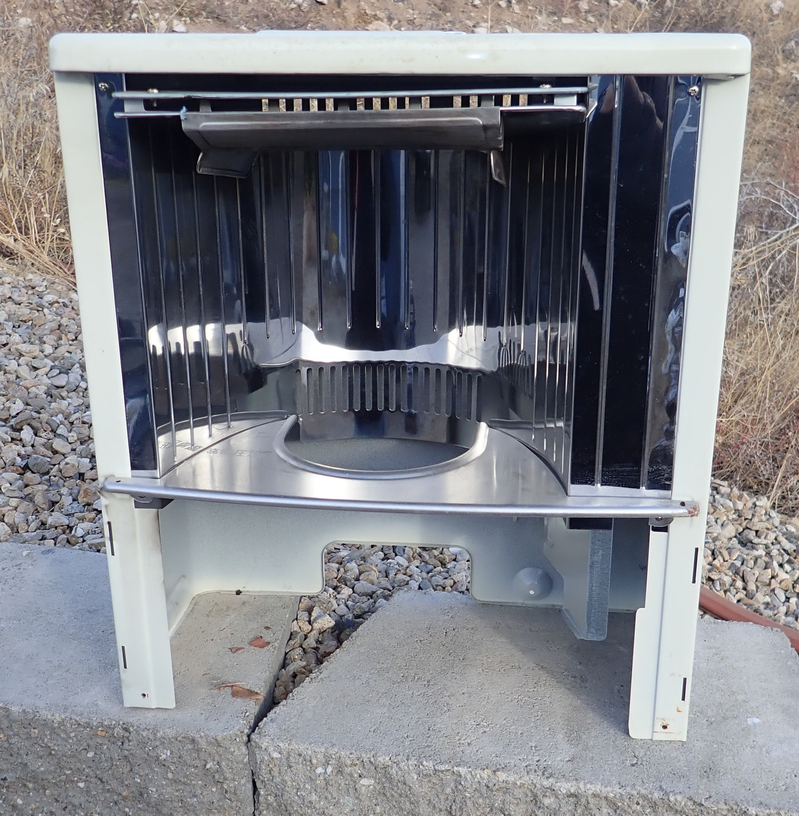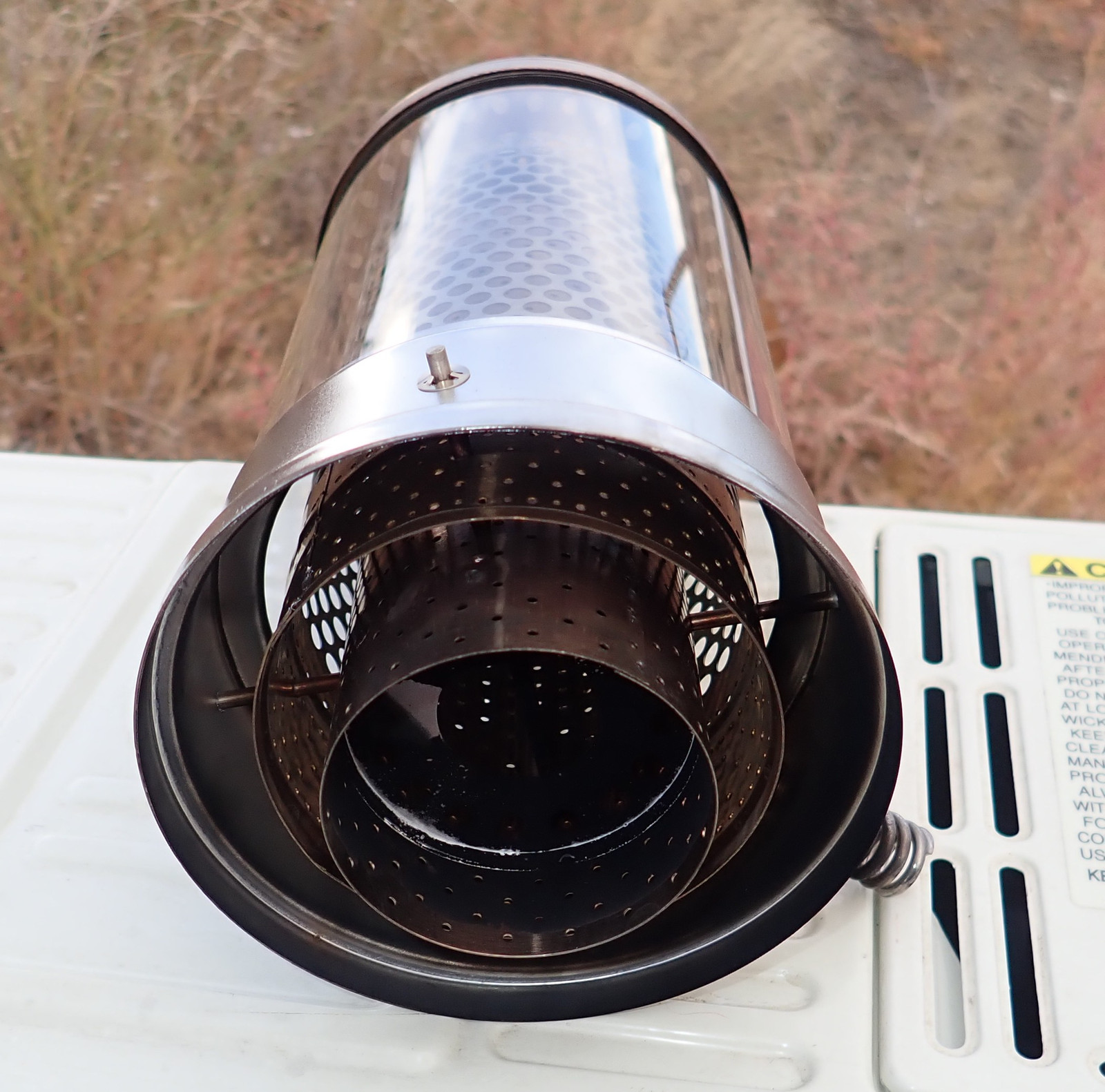 The actual heater catalytic bits lift out easily - it’s a series of loosely nested cylinders inside a glass outer shield. This is a catalytic type heater, which means that the bulk of the heat comes from the fuel reacting along these metal cylinders, without needing much in the way of flame. I can’t find much in the way of details of how this works, but in operation, the cylinders glow orange, and copious amounts of heat come off them. There are some older radiant heater types that use just a flame-heated element, but unless you’re into antique heaters, everything you’re likely to find is a catalytic type. They burn quite clean, and you want one.