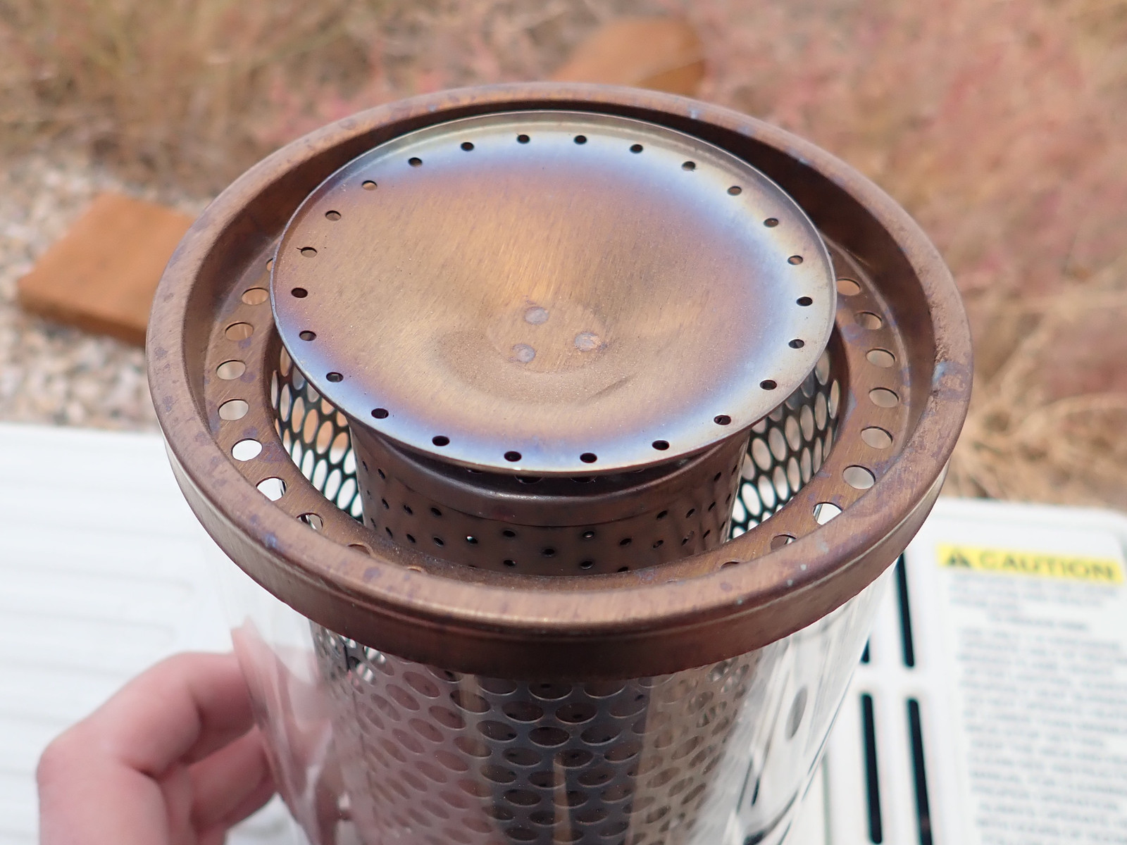 There’s no good reason to pull the top of the heater off. Should you do so, you’ll find this - the top of a multi-layer heat deflector that routes combustion gasses out to the front. Yes, it will soot up in the wind. But there’s no reason to remove the top of the heater unless you’re cleaning it off after some outdoor use.