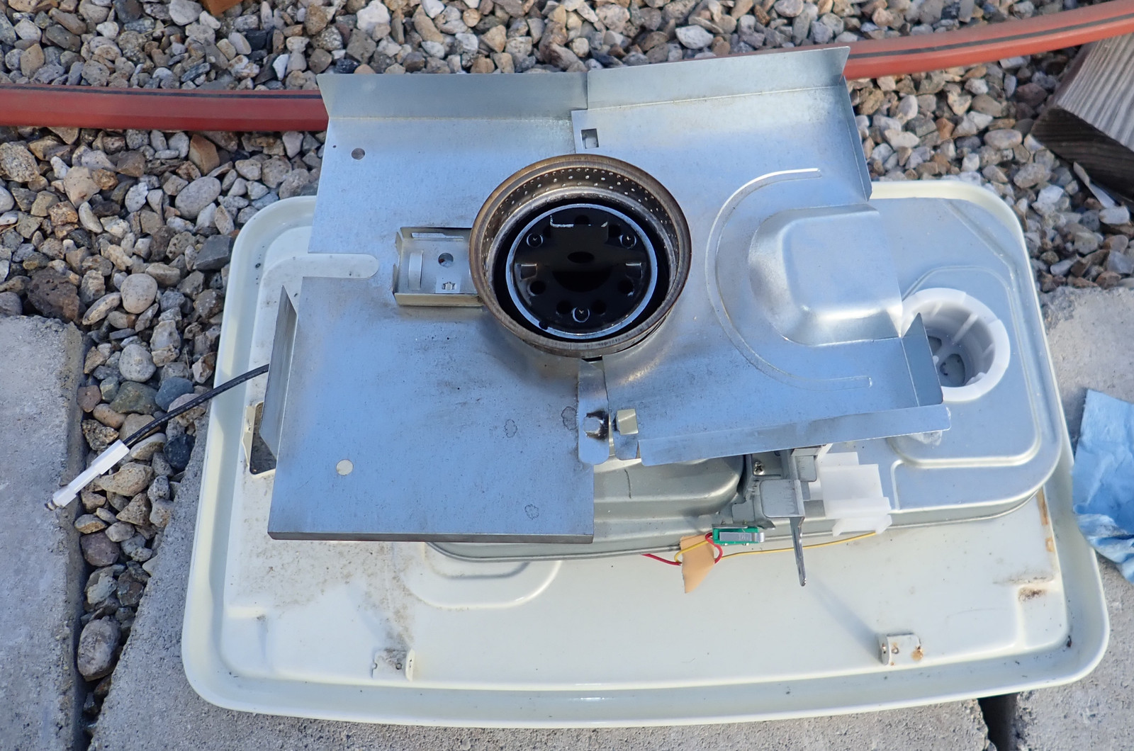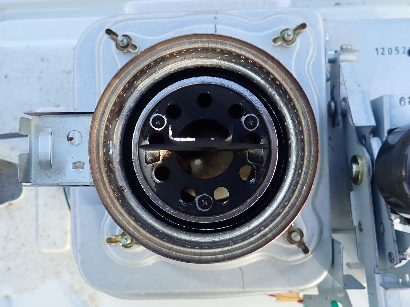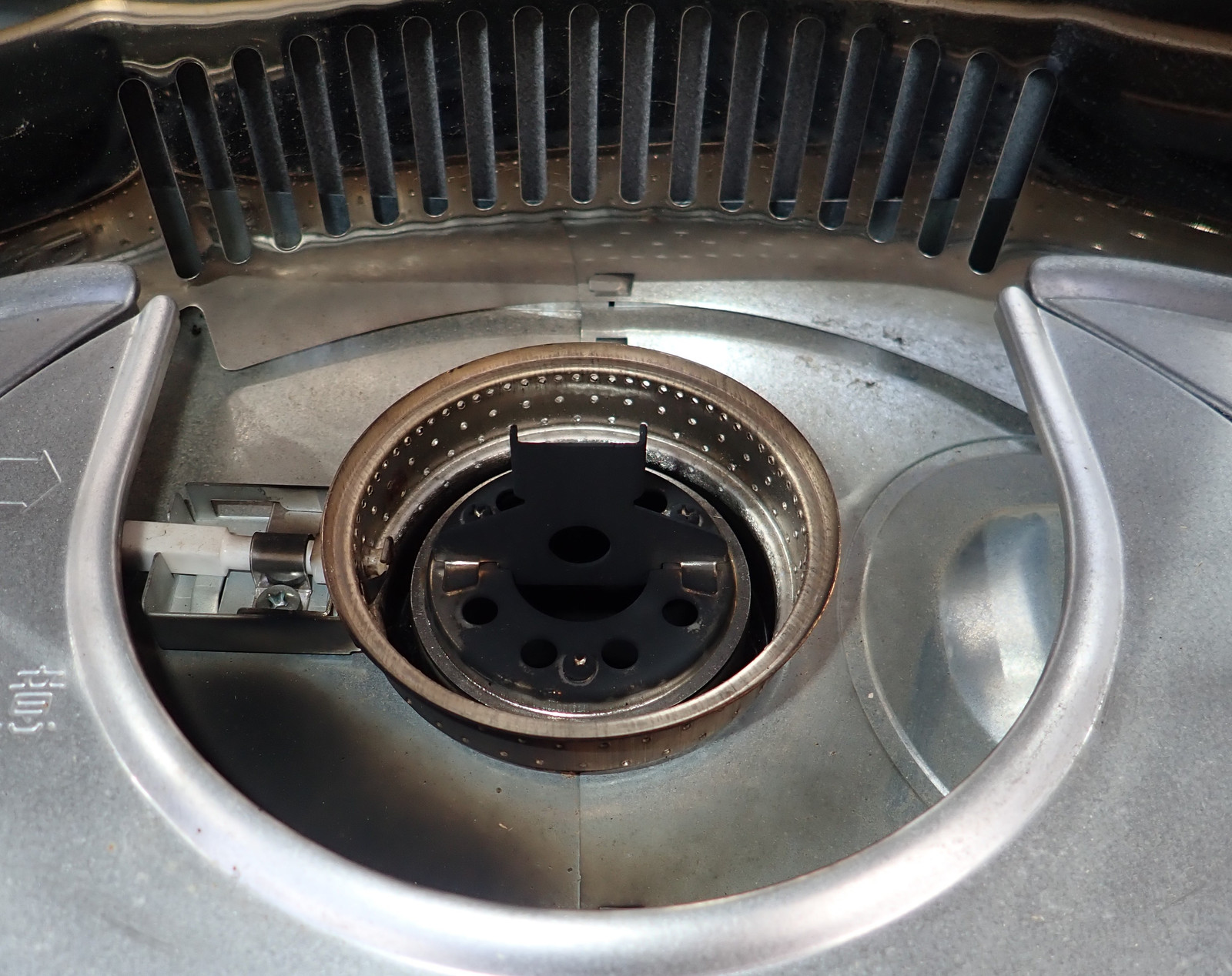 With the catalyst out, you can see the (rather sooted up) core of the burner - the wick comes up around the edge, and air holes around the side and in the center provide for combustion air. On the left is the igniter, which I’ll also cover later. Here, the wick is fully retracted down into the slot, which is the “Off” position. No air can get to it, so the flame rapidly goes out. There’s a lot of soot in the lower left, which is related to why I’m pulling this one apart to clean.
