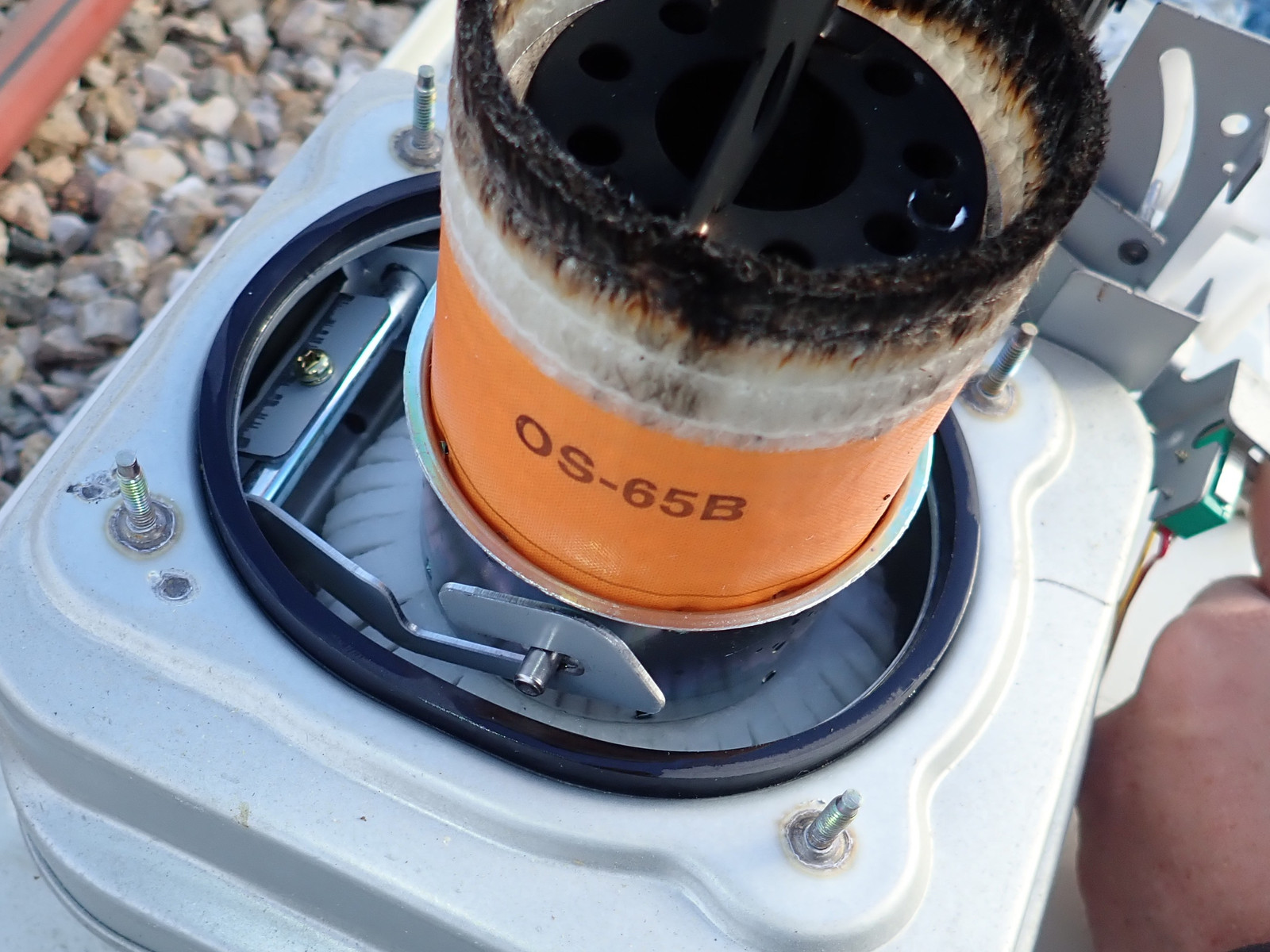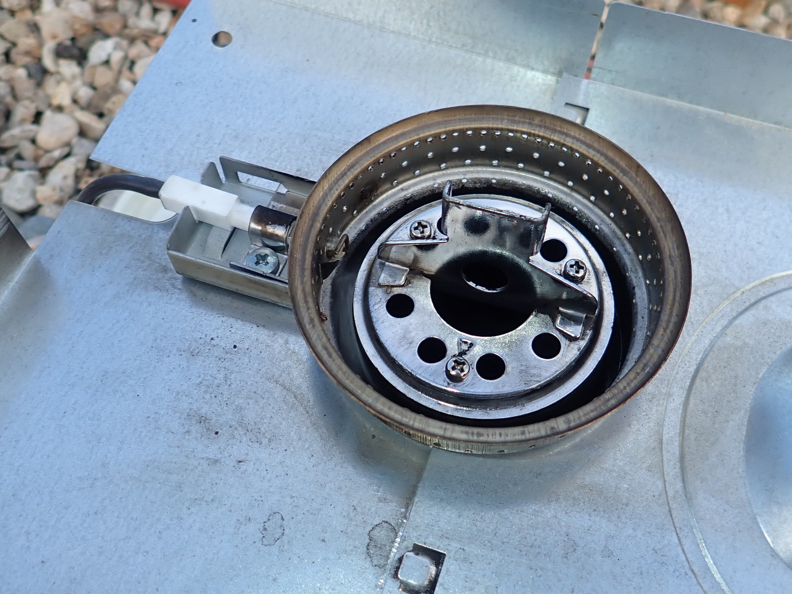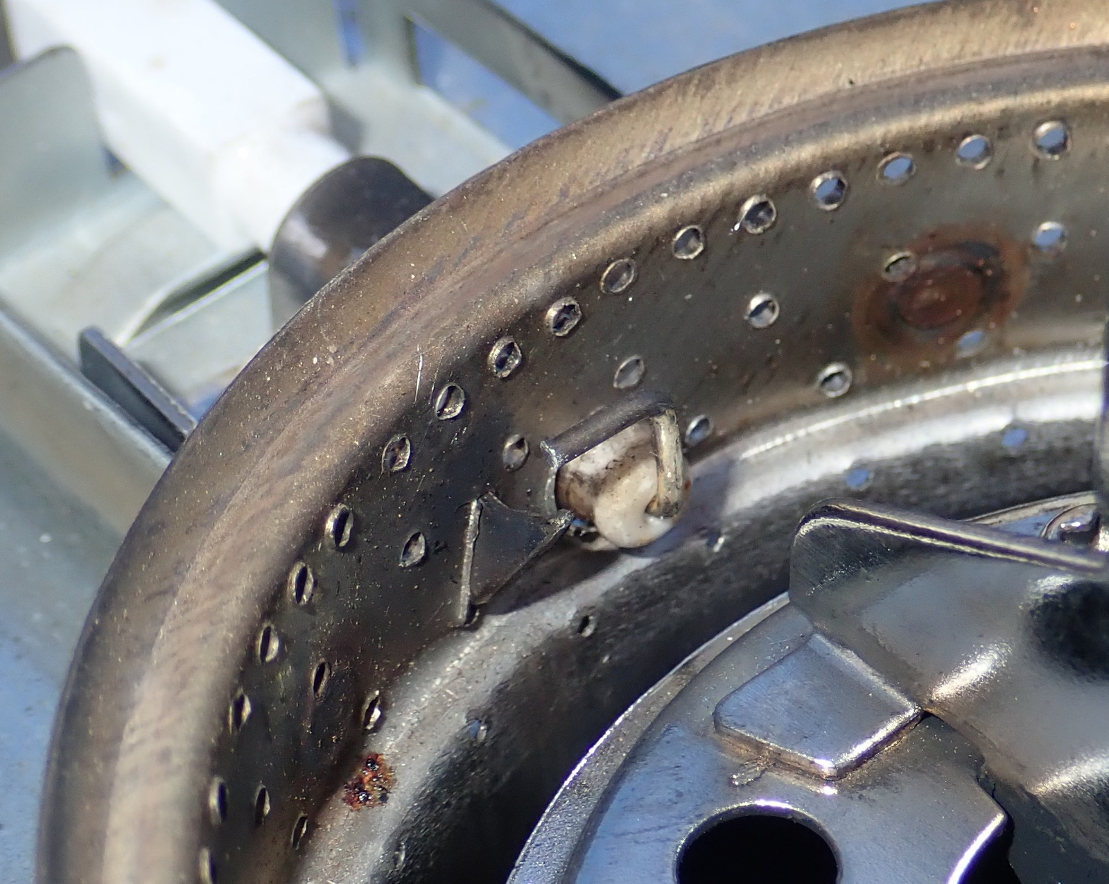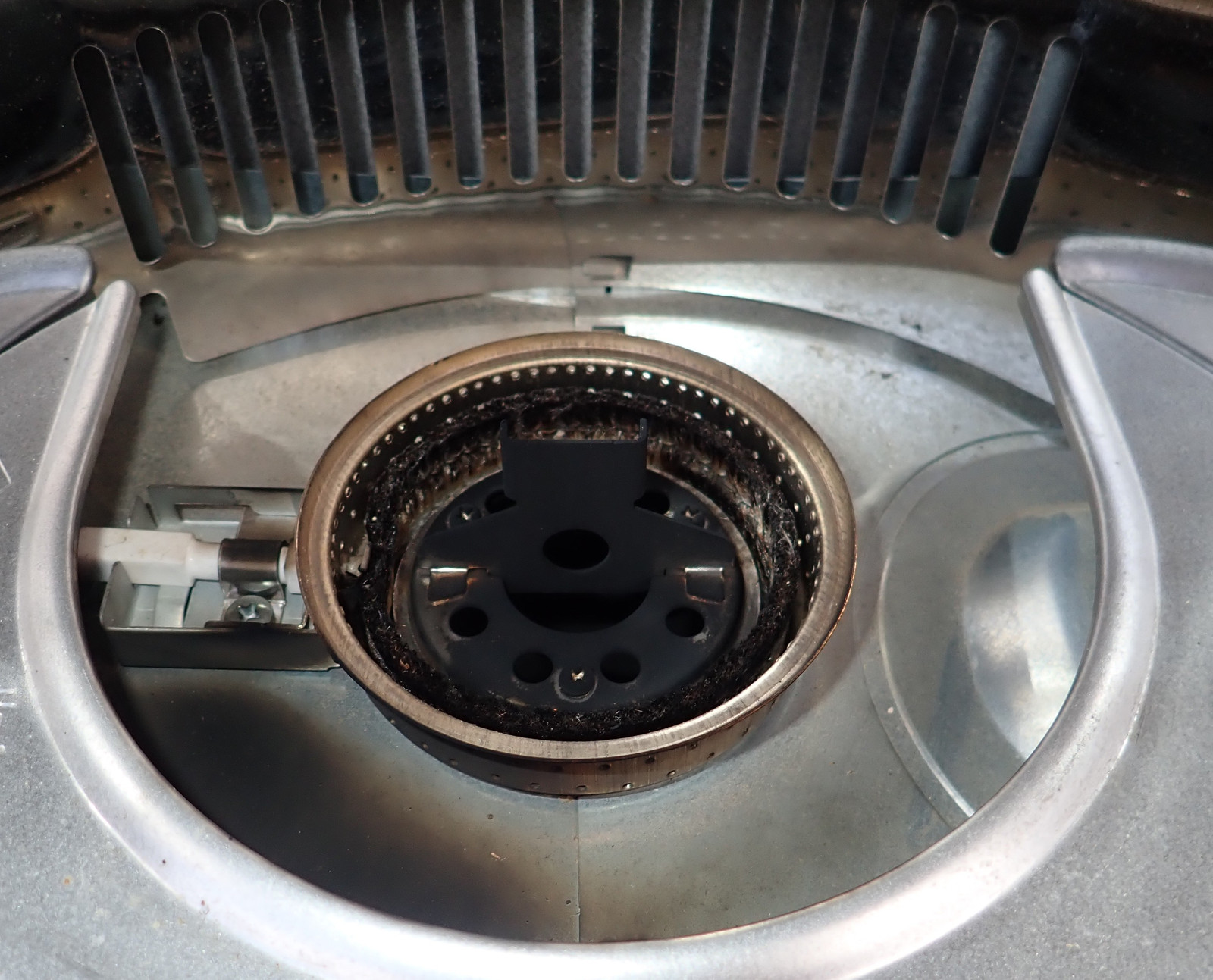With the catalyst out, you can see the (rather sooted up) core of the burner - the wick comes up around the edge, and air holes around the side and in the center provide for combustion air. On the left is the igniter, which I’ll also cover later. Here, the wick is fully retracted down into the slot, which is the “Off” position. No air can get to it, so the flame rapidly goes out. There’s a lot of soot in the lower left, which is related to why I’m pulling this one apart to clean.