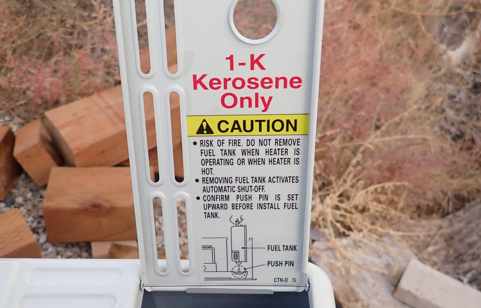 The fuel tank, meanwhile, pulls out from the heater for refueling. It’s a metal tank, with a level gauge at the bottom. It holds kerosene. It has a lot of warnings about not putting gasoline in it. If you recall the last post, you’ll remember that gasoline has a flash point (combustible vapors) of around -40 - and kerosene is around 140F. Don’t fill this tank with gasoline.