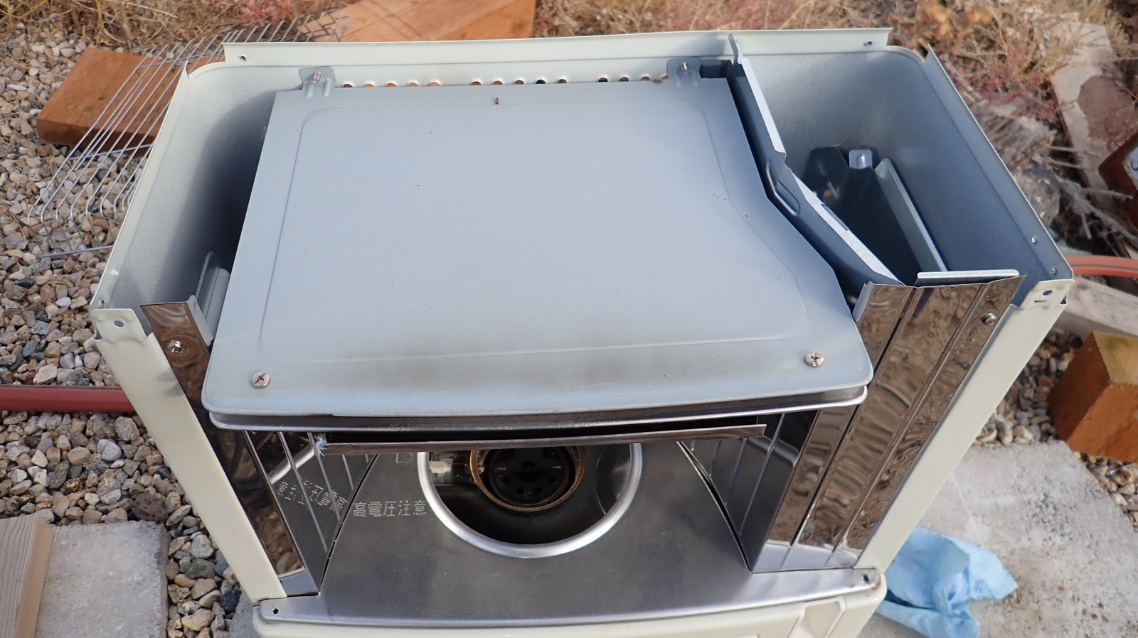 The top of the heater has, in addition to stamped bits and pieces, a door on the right side. The fuel tank goes down that opening.