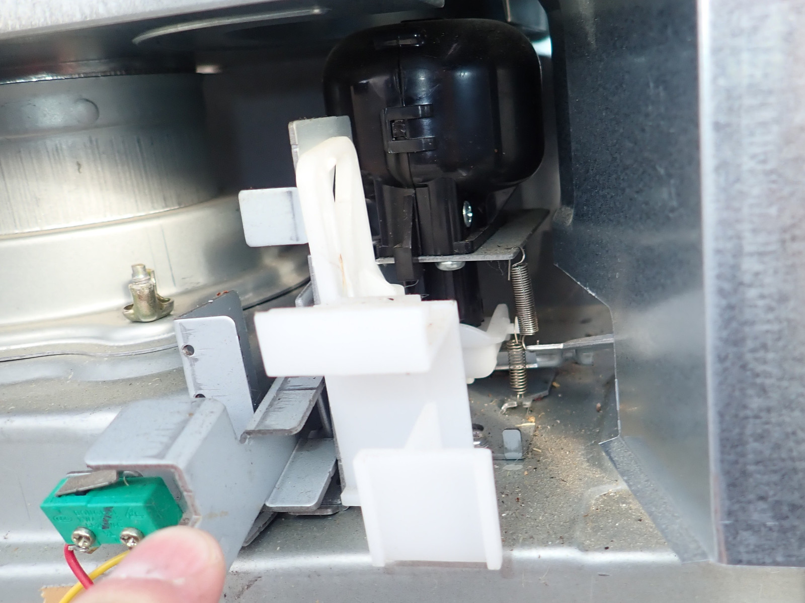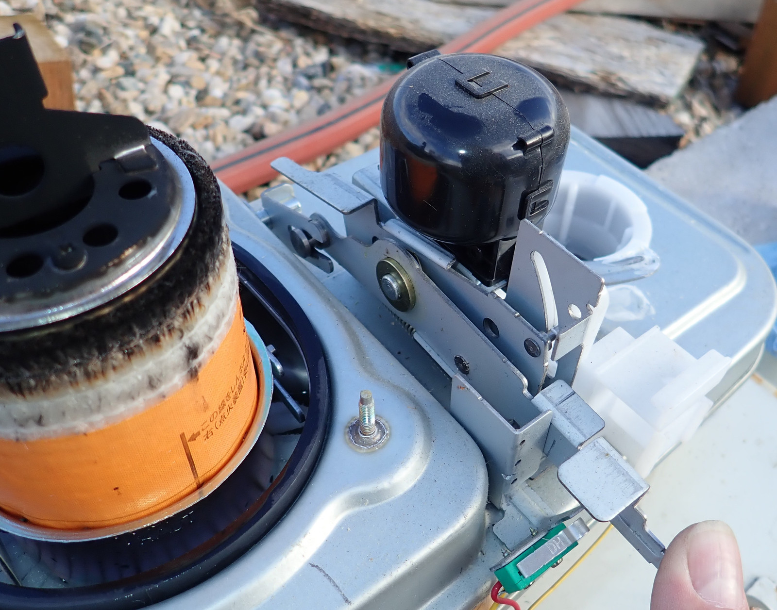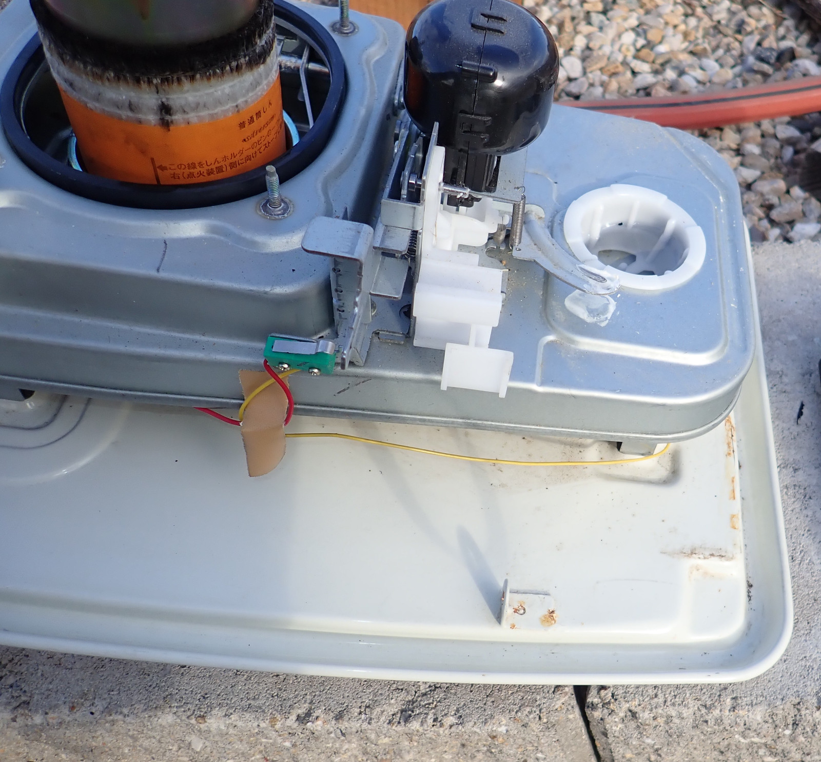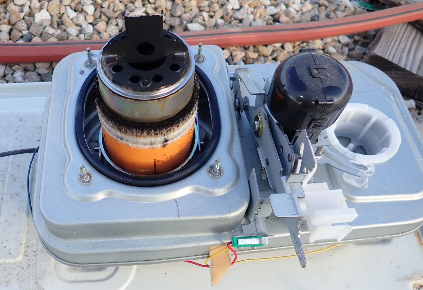 The other side contains various releases and catches. On the left, the white lever is the “off” button from the outside and will drop the wick when pressed. The curved tab with some grease under it is the fuel tank lever - the tank presses down on it when installed, and if you remove the tank, the wick pops down. Finally, the weird black cylinder took some time to work out, but it’s an angle sensor. Tip the heater too much in any direction, that trips, and also drops the wick. So, lots of ways to have the wick drop when normal operating parameters are exceeded.