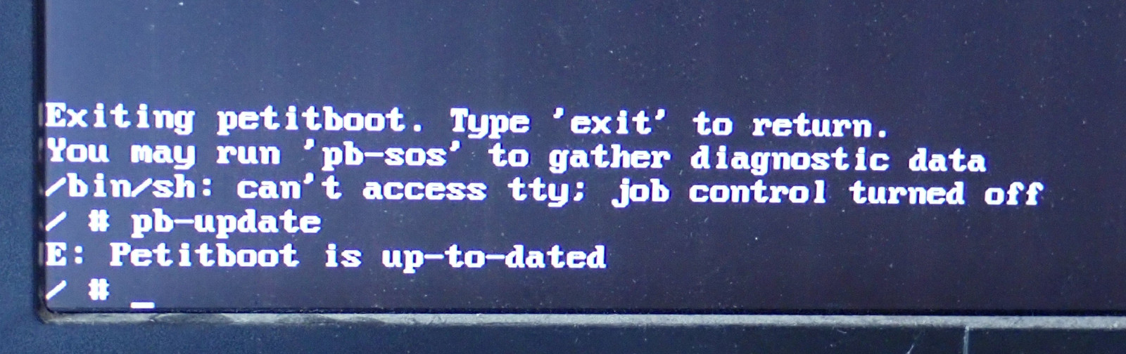 Plug the N2+ in, attach your assorted cables, set the boot switch to SPI, and you should see a boot menu. Exit to the shell, and run pb-update - it should, if all goes well, spend a few minutes in the firmware update process. If it tells you Petitboot is up-to-dated, you’re good! If your firmware is too old to have pb-update, just go download an image to an SD card, it’ll work.