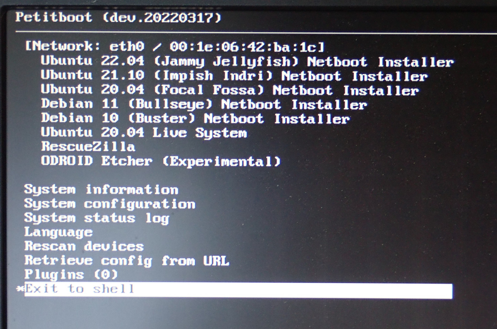 After rebooting, drop to the shell again and run netboot_default - it will spit some IP information out and drop you back to the shell. Now exit (ctrl-d ought to do it), and you should see a bunch of Netboot Installers up at the top of the screen. Yes, you’re about to netboot an installer across the internet - the future, on occasion, does turn out some pretty neat tricks!