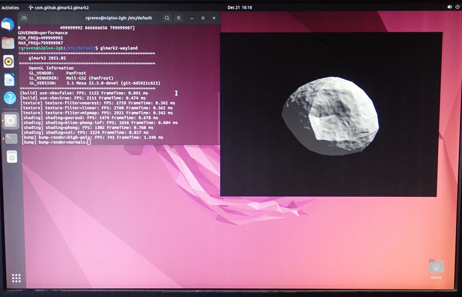 Despite all this, there are certainly some quirks that remain. One of the bigger ones I’ve run into relates to memory pressure and the GPU - if you’ve got enough stuff running, some programs struggle to create a new window (or menus flicker, or… just weird things). Close a few other things, and they work. I’m reasonably convinced this is related to the Contiguous Memory Allocator (CMA) on Linux being “nice” and not carving off space for its own use, and having other stuff intrude in - but I don’t have any great fixes yet. You can reduce the CMA region size and it seems to help a tiny bit (less intrusion, perhaps), but I’ve not found a bulletproof way to solve the issue yet. When you run the GPU out of memory, things lock up for a bit - or just crash entirely. It depends. These aren’t the most reliable systems I’ve ever found, though the issues are software, not hardware. Newer kernels really do seem to help here - the problems have gotten progressively less-bad with newer kernels - but if you see this behavior, this is sort of how things work under serious memory pressure on this system.