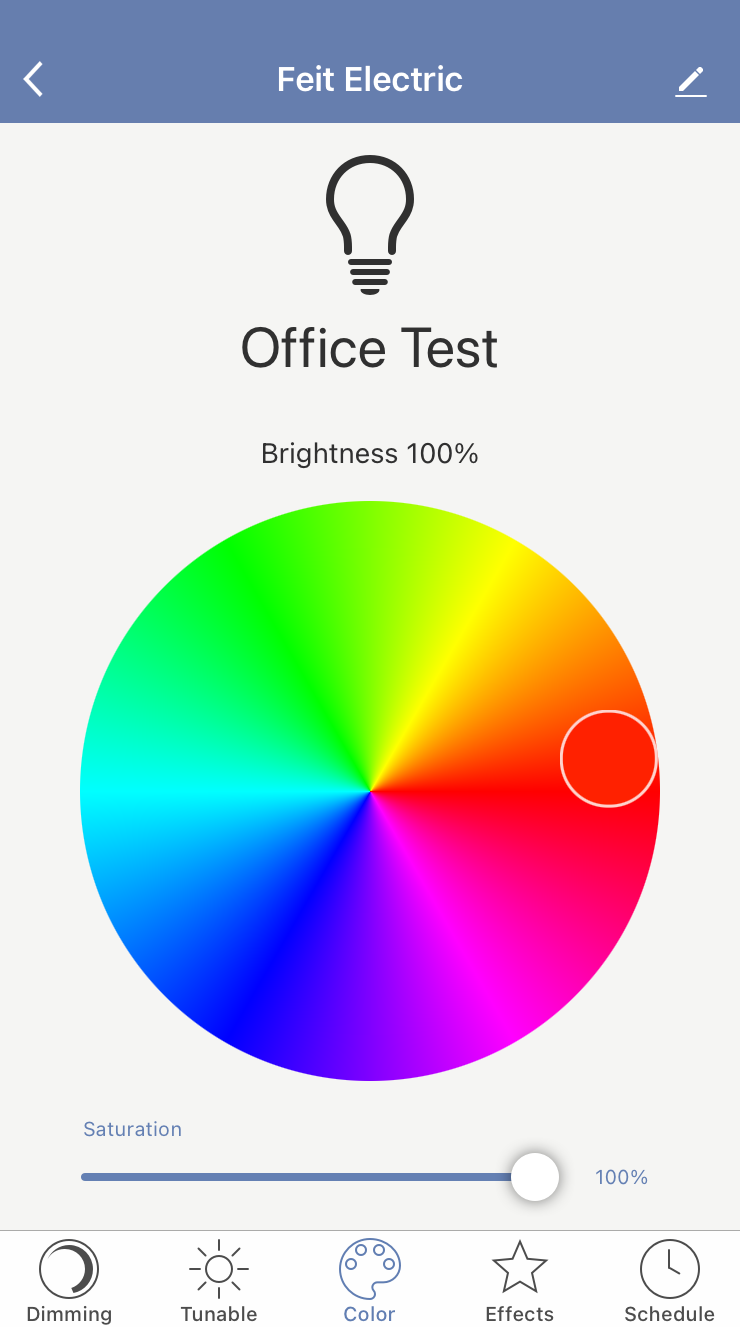 The next interface is the “color” interface. This drives the various RGB modes of the smart bulb. Drag to the color you want. The “Saturation” slider along the bottom allows you to go from fully saturated colors at 100% down to more or less white at 0%. If you want a pink (for… oh, I don’t know, a gender reveal party that doesn’t involve starting wildfires or catching cars on fire, you can do it by setting the color to red and the saturation slider to about 75%. You get pink. The interface isn’t very useful, and the color wheel doesn’t seem to actually do anything except select the color - one would expect that picking a spot halfway between the center and the rim might do something different with the light, but if it does, I can’t tell what it does. There’s also no ability to specify a color in RGB levels, or with anything more than a “fat finger interface.” Precision is not present.