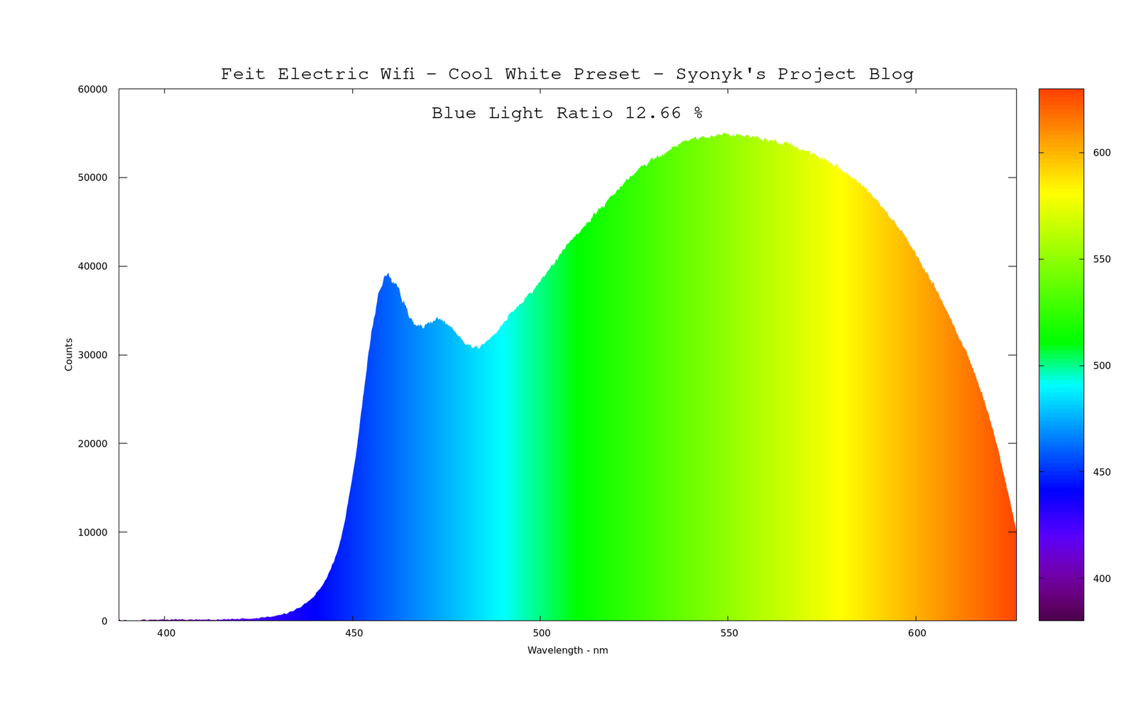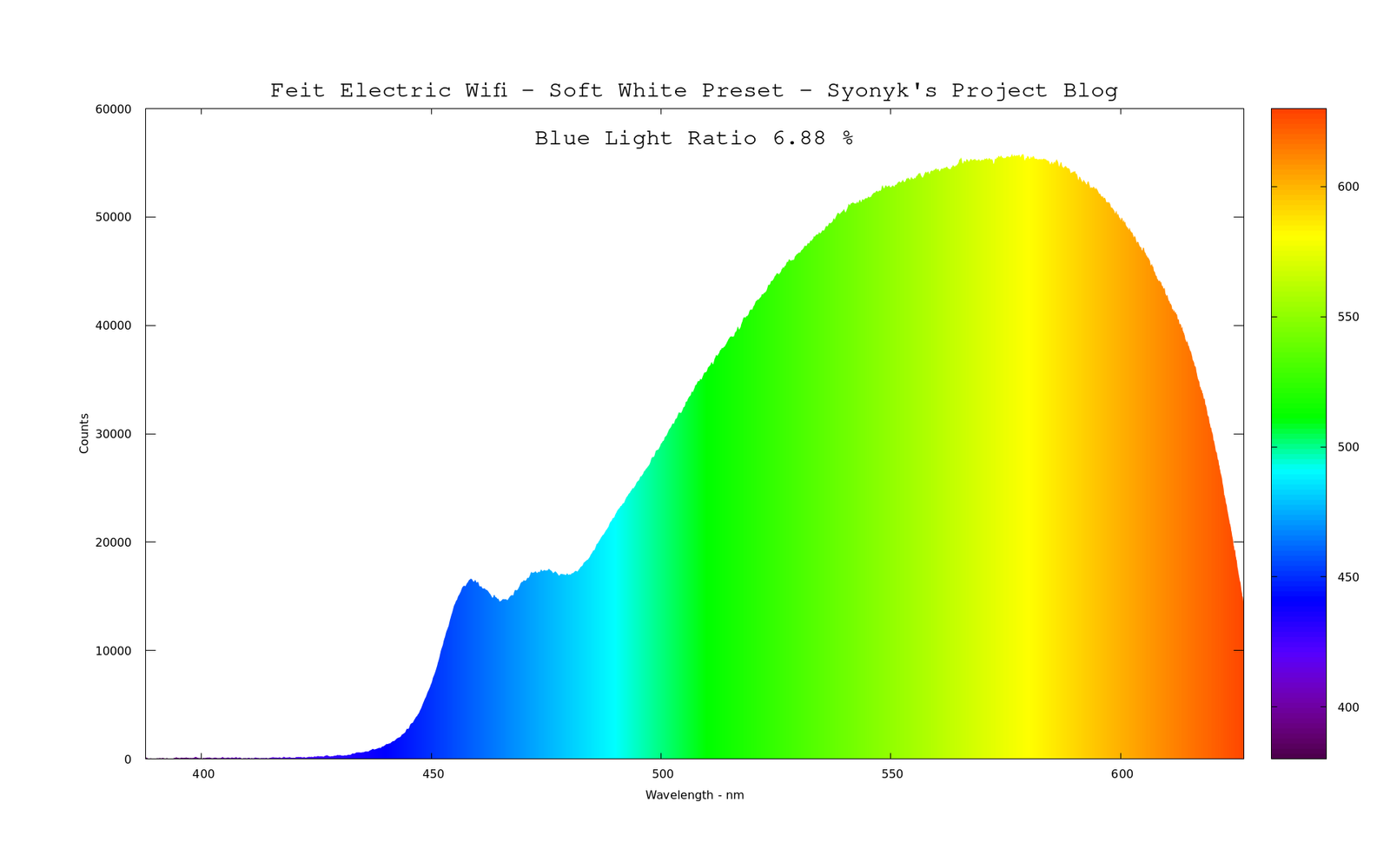 Starting off in the “Soft White” (should be somewhere around 2700K), it shows a standard enough “warm white LED” pattern - an awful lot of blue down at the bottom end, and then the broad phosphor arc from the magic that makes white LEDs work. It’s rather high in blue, even in the “warm” preset, compared to some other bulbs. That, alone, should disqualify the bulb from use in the evenings.