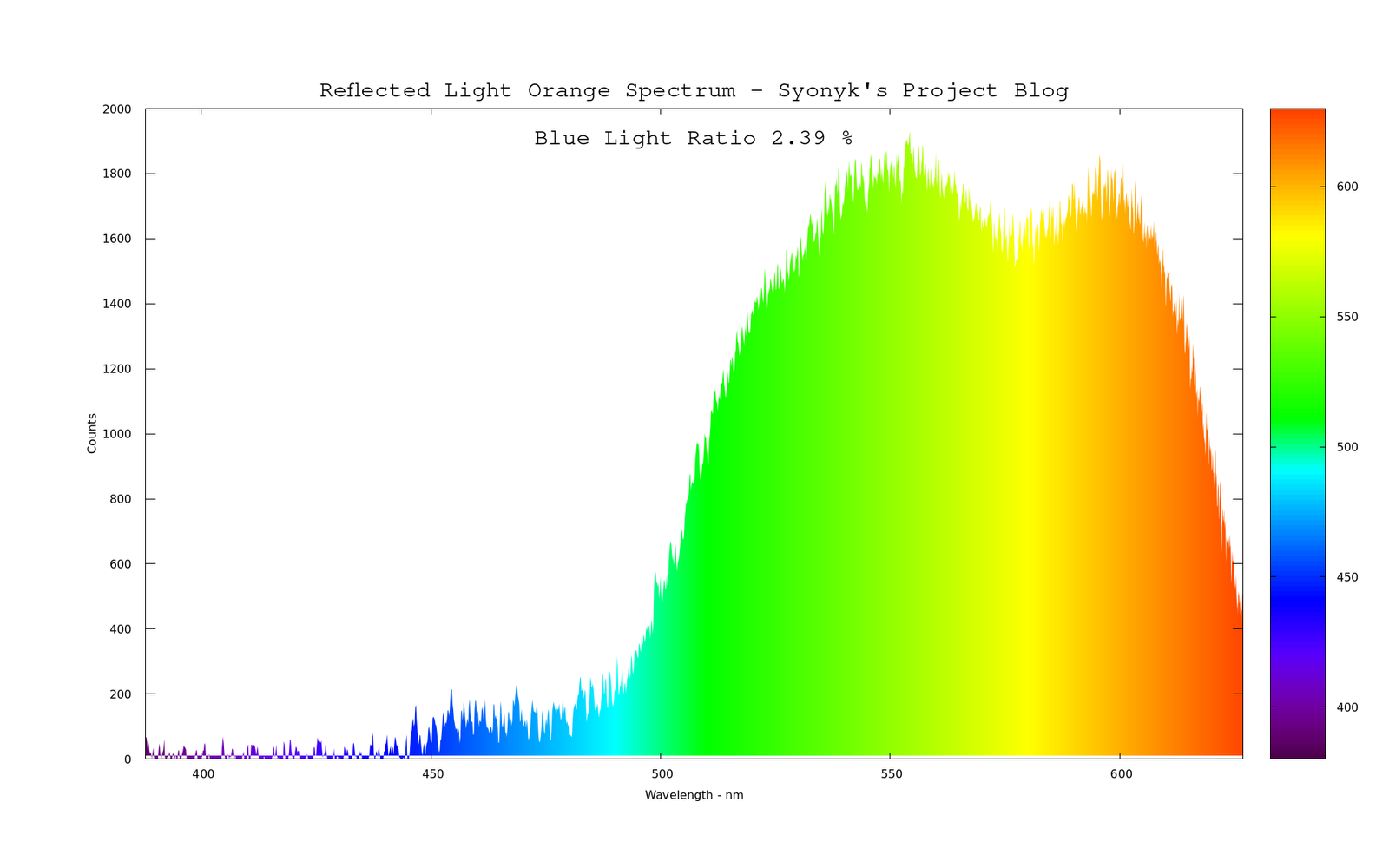 If I look at the spectrum of something that’s actually orange in reflected (white) light, it looks a lot more like this - though I still think I’m seeing some of the dye colors being reflected (it’s an orange of roughly the same tint on a piece of junkmail).