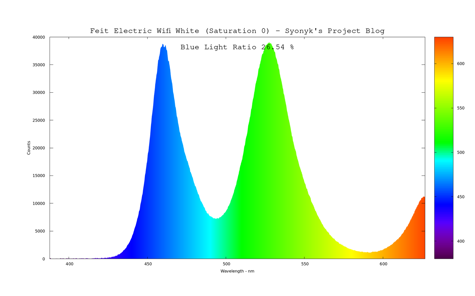 Once you switch to the RGB mode, the white LEDs go away entirely, and everything you see is a result of the RGB LEDs. Turn the saturation slider down to zero, and you get white light - but it’s not really a broad spectrum white. If you’ve played with RGB LEDs enough, you know what I’m talking about - it’s “RGB White,” and it’s not a very pretty color. Gone is the “blue LED pumped white LED” spectrum curve, and in its place is something very, very RGB. It’s worth noting here that while it looks like there’s not much red, this is a weakness of my spectrometer - the unit I have is optimized for the 400-580nm region, and it’s dropping off pretty hard in response as the colors head off into the reds. The red here is very red - the peak wavelength is somewhere north of 625nm, and my unit simply doesn’t reach up that high in current calibration.