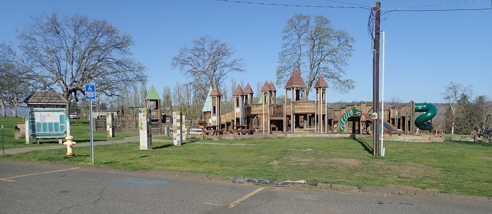 We had a morning with nothing much going on, so went up the hill to Sorosis Park - and they’ve got an awfully nice big wooden play structure for the kids! It’s castle themed, and has quite a few interesting features, including some sound tubes linking various parts of the play structure for “shouting through tubes” purposes - which, apparently, is a great deal more fun than just shouting across the play structure!