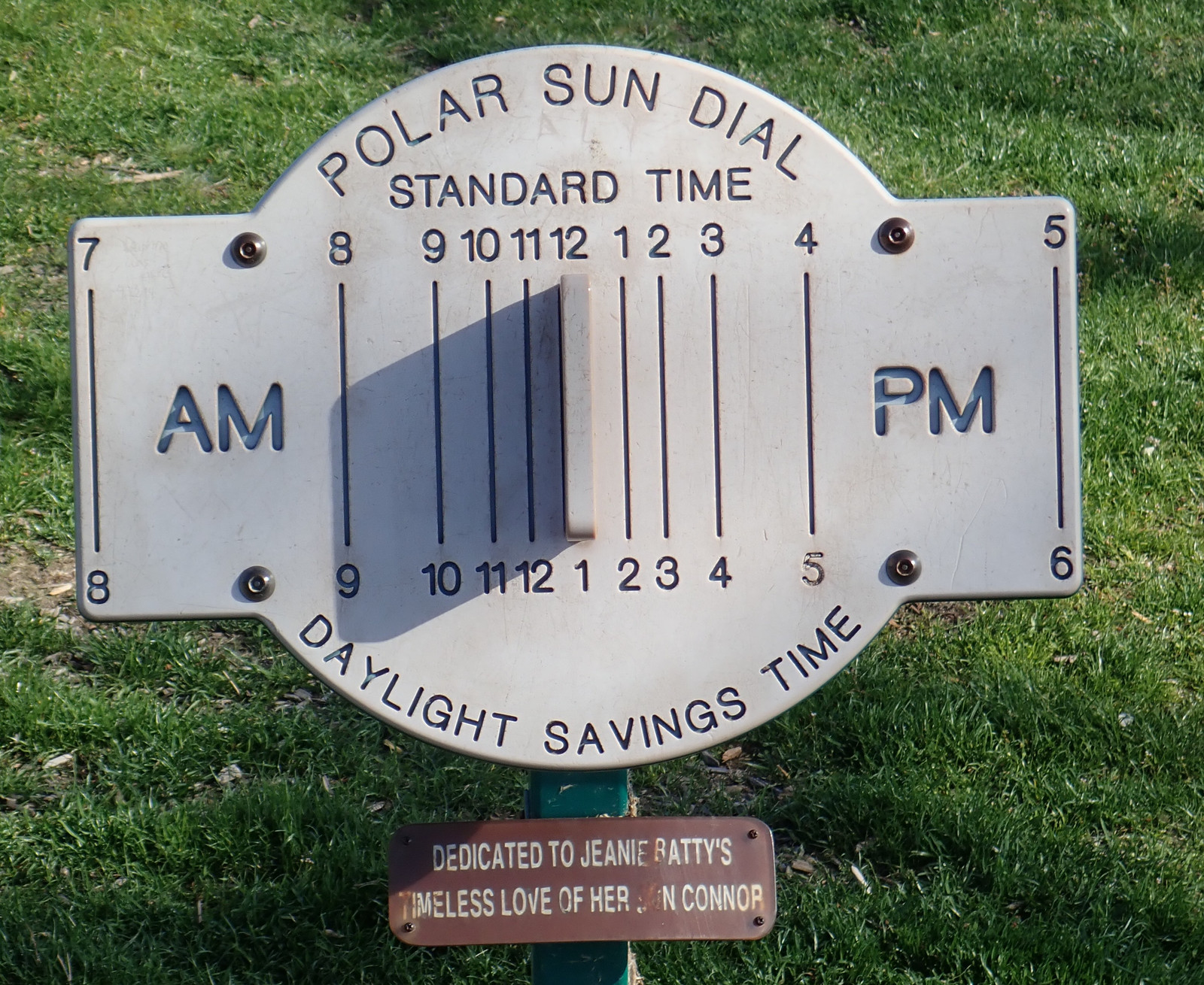 There’s a polar sun dial near the playground, in case you aren’t sure what time it is. It’s a simple enough design. I really should build a sundial for our property one of these years. I like the simple solution to standard vs daylight savings time.