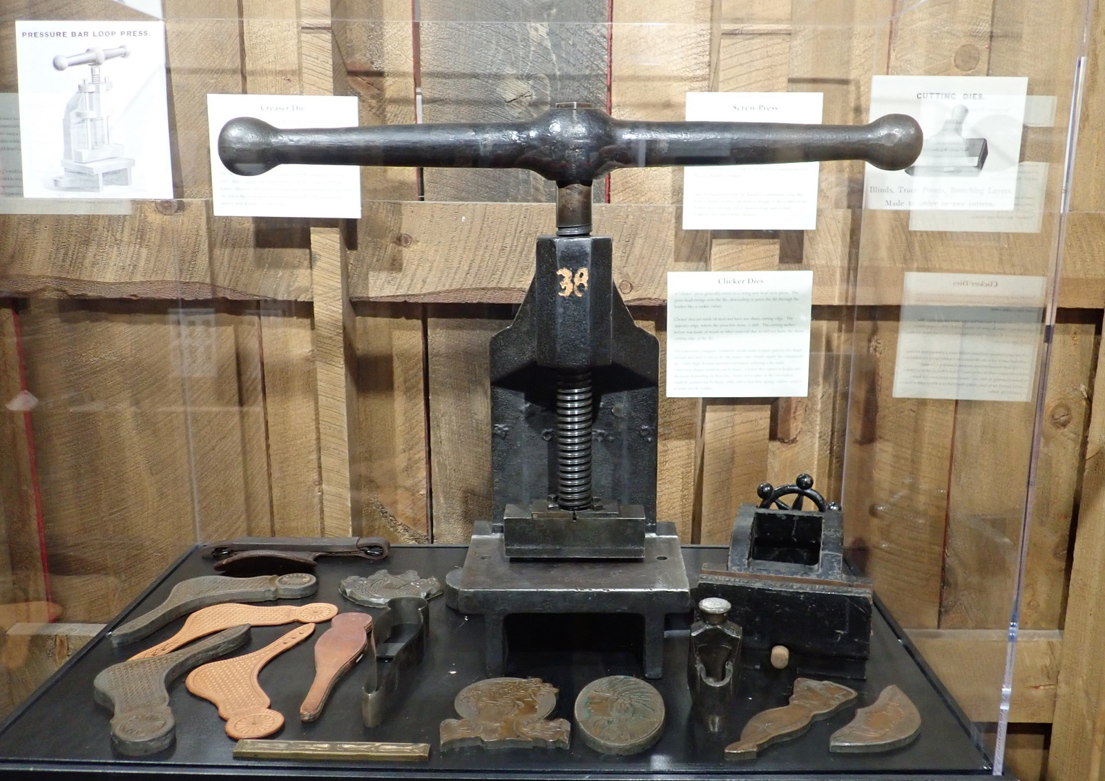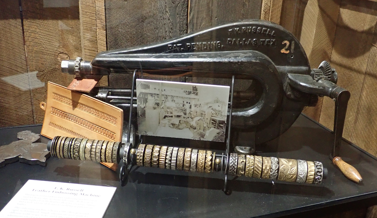 Leather embossing appears to be a simple “brute force” sort of thing - press a patterned steel wheel into leather, very hard. Hand crank on the right, embossing wheel on the left, and a massive set of jaws to let you work large pieces through. Select wheel, squeeze leather.