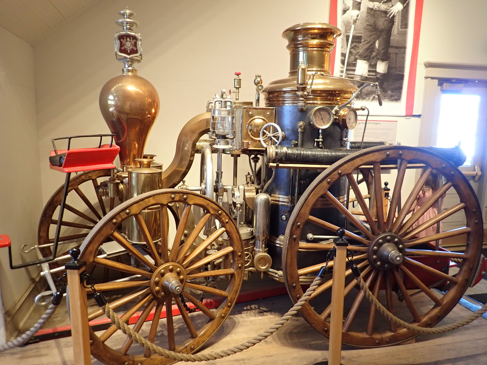 This is a 1879 Amoskeag Steam Fire Engine. Rated at 550 gallons per minute, it was kept with the boiler pre-heated and a bed of coal already laid in the boiler, so that during the 10 minutes or so it took to get to the fire site (horse drawn), it would build up a head of steam and be ready to pump from whatever water source was available. In 1892, the town got a fire hydrant system, rather improving the capabilities of this sort of pumper. This engine remained in service until 1915, when the town upgraded to motorized engines. At 6700 lbs, the horses tended to get tired quickly when towing it.