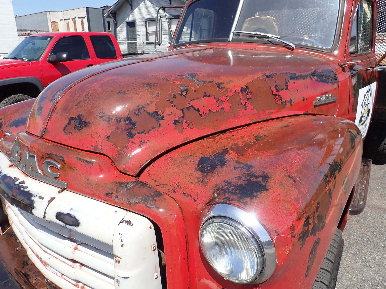 On further investigation, the worn finish has a layer of clearcoat over it. The whole truck’s finish is covered in a nice matte clearcoat as you can see at this angle quite well (look by the headlight for the reflections). I’ve no idea what, why, or… well, why. It seems, based on the bare metal, that the existing patina was sanded or wire brushed in some areas, and at that point, I’ve no idea if this is actually the original finish that’s been cleaned up and protected, or if someone paid a lot of money for a “weathered finish” that was applied on top of bare metal. But someone went out of their way to protect the aged finish in the current state, and that’s just baffling to me. I guess this would be a “show old truck”?