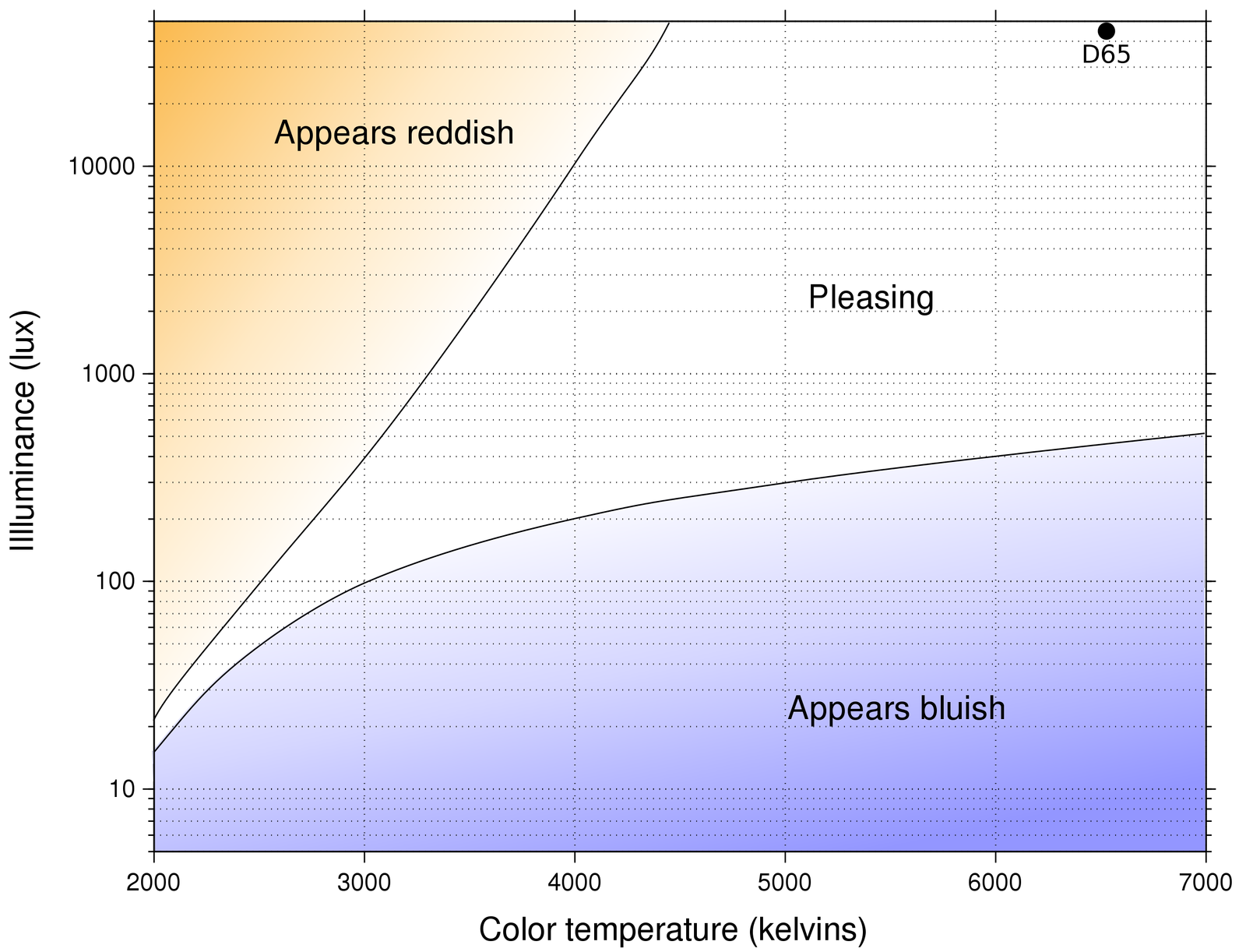 And, in fact, there’s even some research on this! The Kruithof Curve describes, subjectively, how human preference on light changes with overall brightness, and it looks something like this. People just don’t like dim light to look much other than rather red.