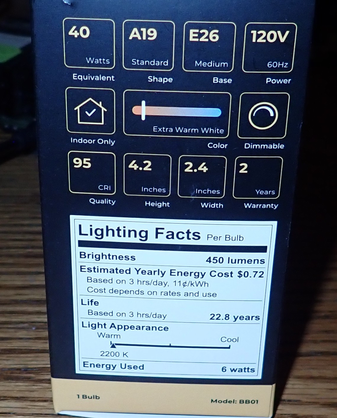 The bulb claims to be a replacement for a 40W incandescent, which seems about right with the light output. They’re very warm (2200K - most “soft white” LEDs are 2700K), dim rather nicely, and claim a high CRI - though, of course, they don’t mention the R9 value.