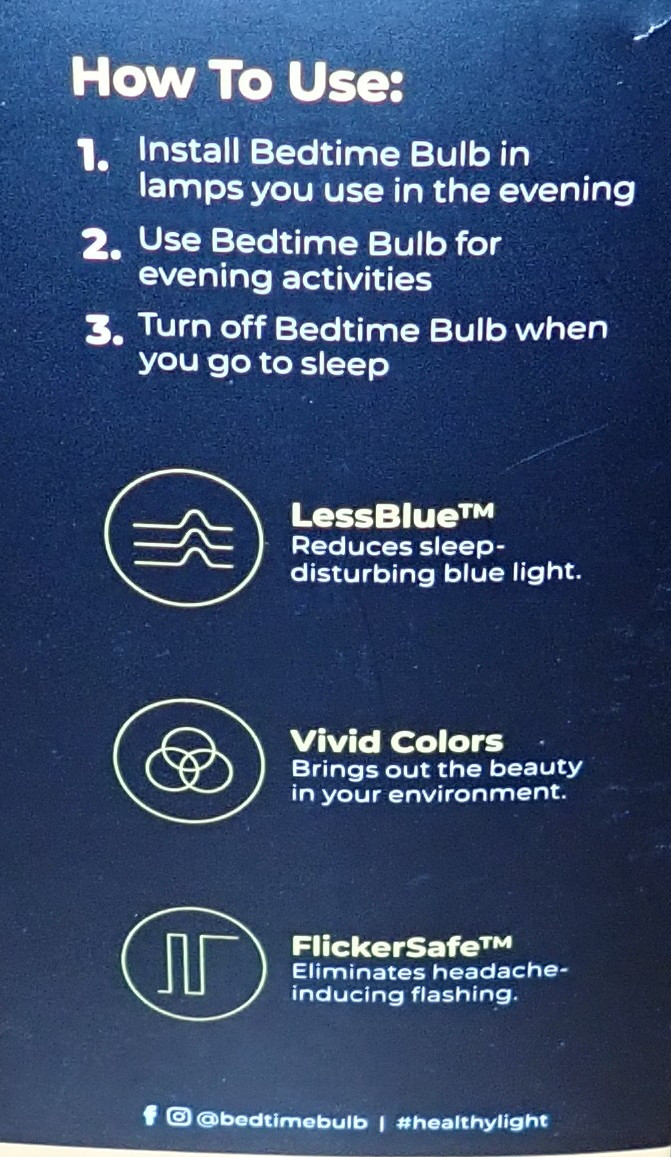 I’m starting out with a bulb that’s specifically sold as an “evening time bulb” - replace your other LEDs with this, use it in the evening, and it’ll help you sleep. You can buy them from Amazon , from eBay, or direct from the Bedtime Bulb site, and the directions helpfully tell you to put them in your evening lights.