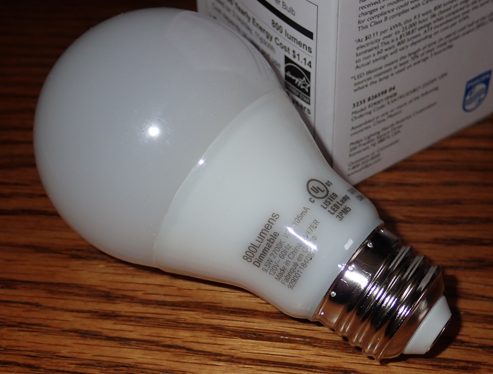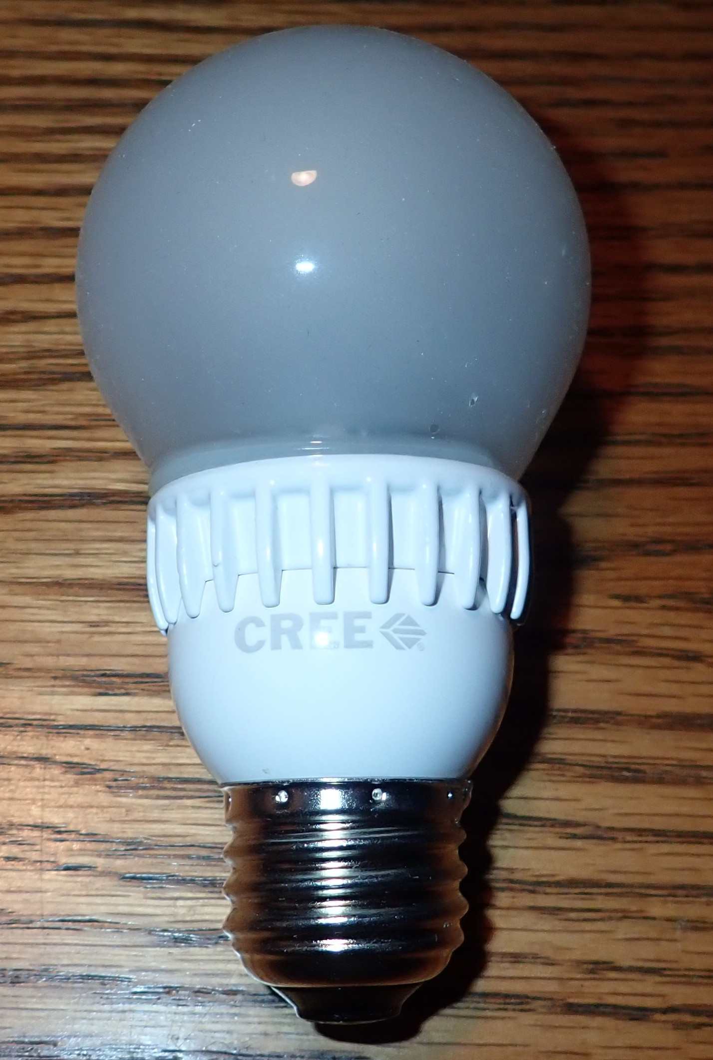 The next bulb I’m looking at is an old Cree bulb - I got a used one on eBay because, of course, these aren’t sold new anymore (there’s a trend here - another LED I’m looking later isn’t sold new either, and I like that one too). I want you to take a look at the heavy heatsink around the base of this bulb. Older LEDs had enough heatsinking that they didn’t overheat, even in enclosed fixtures, and this is a perfect example of it. The envelope is glass, and it’s coated with a bit of a rubber layer to help keep it from breaking. The new stuff doesn’t have the heatsink and is a cheap plastic enclosure. They overheat, and I’ll bet this bulb will long outlast the newer ones, because it’s designed to work, not designed to be cheap.
