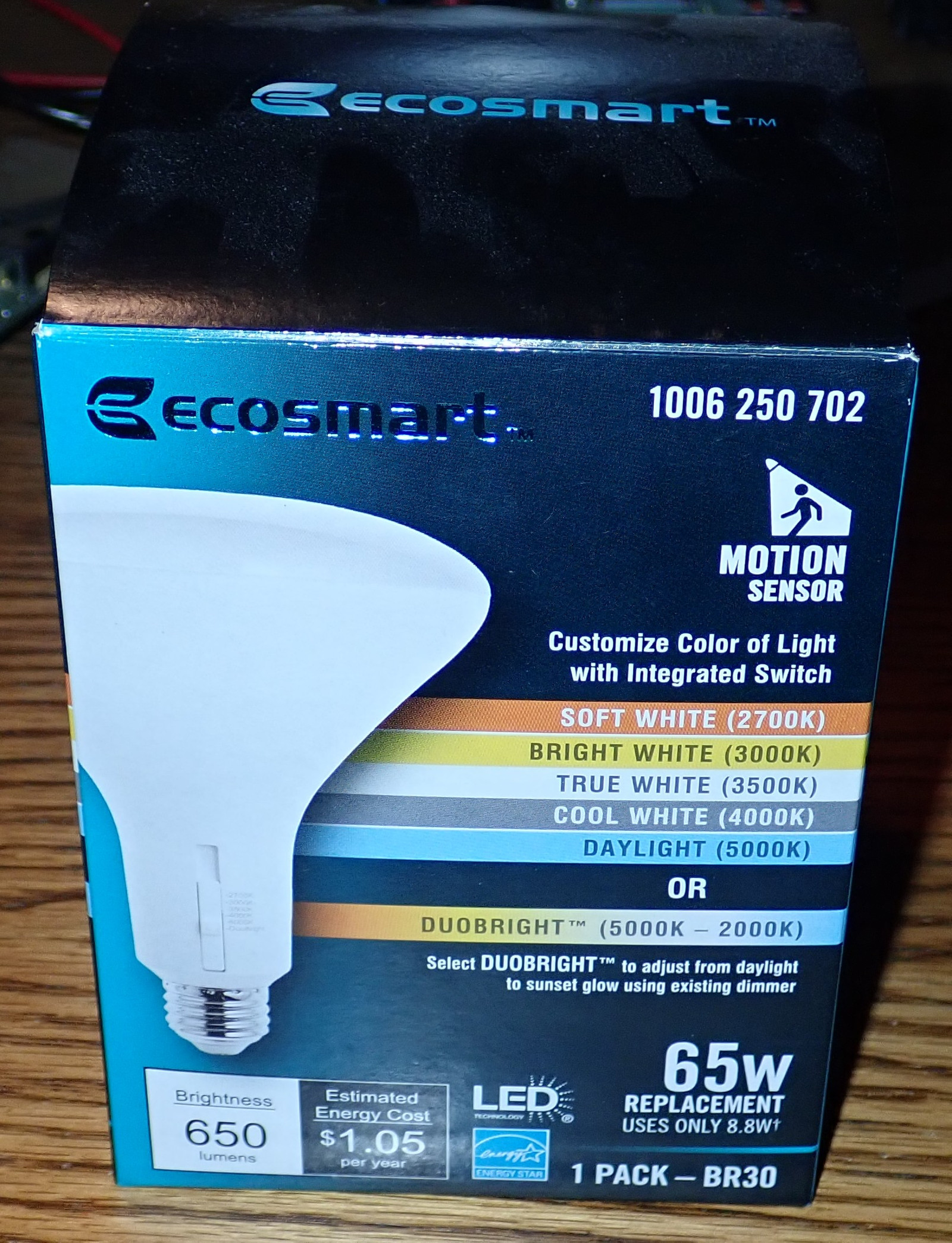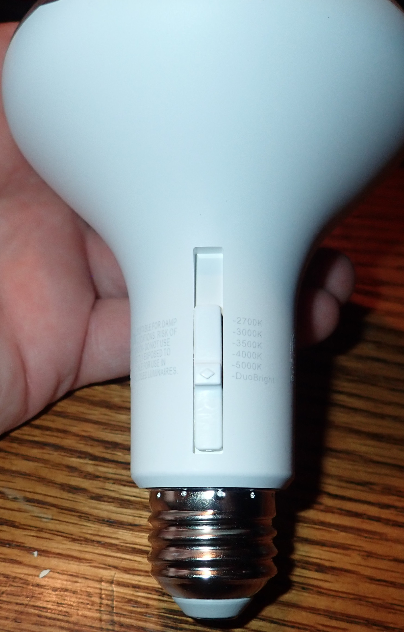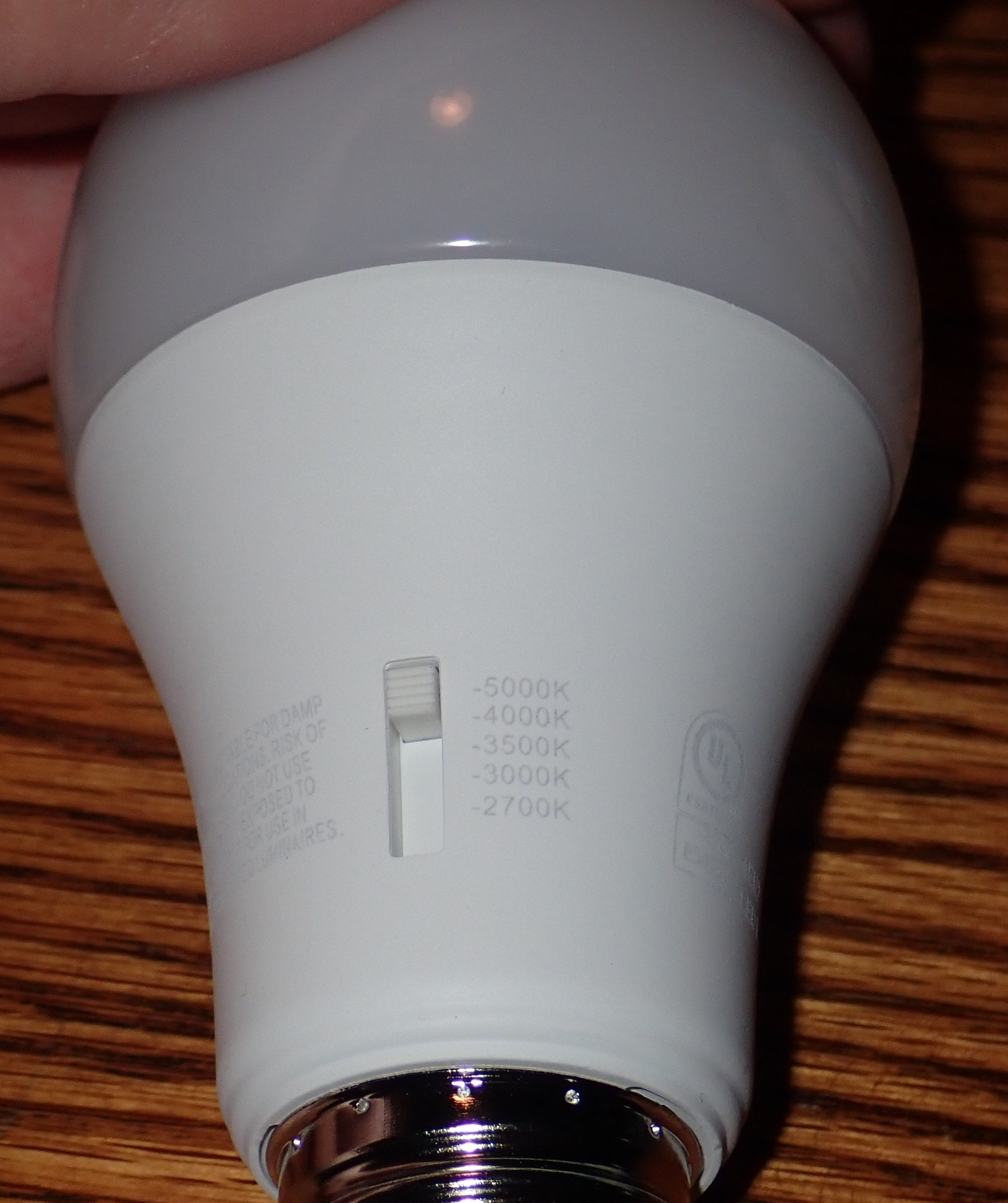 My next bulb here is an example of something fairly new - it’s a bulb with a switch on the side that allows you to select the color temperature at installation time. This one, as I found out when I got it home, is actually a motion sensor light, and I have to say, a dimmable, color temperature selectable, motion sensor light is… well, it’s obviously a thing, but I can’t exactly figure out what it’s for.