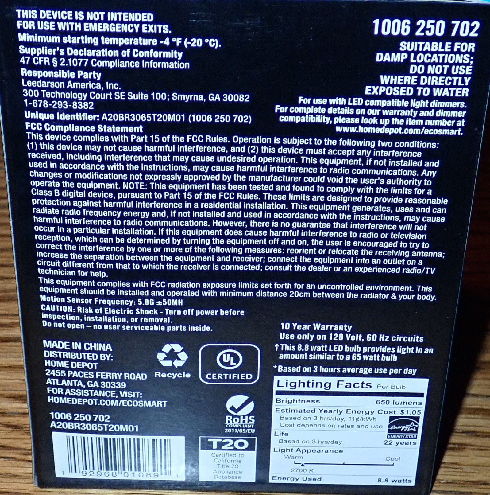 The back has nothing terribly interesting, though these are rated for enclosed fixtures, and can be dimmed (poorly, and I hate the sickly grey you get with dimmed high color temperature LEDs, but they’ll do it).