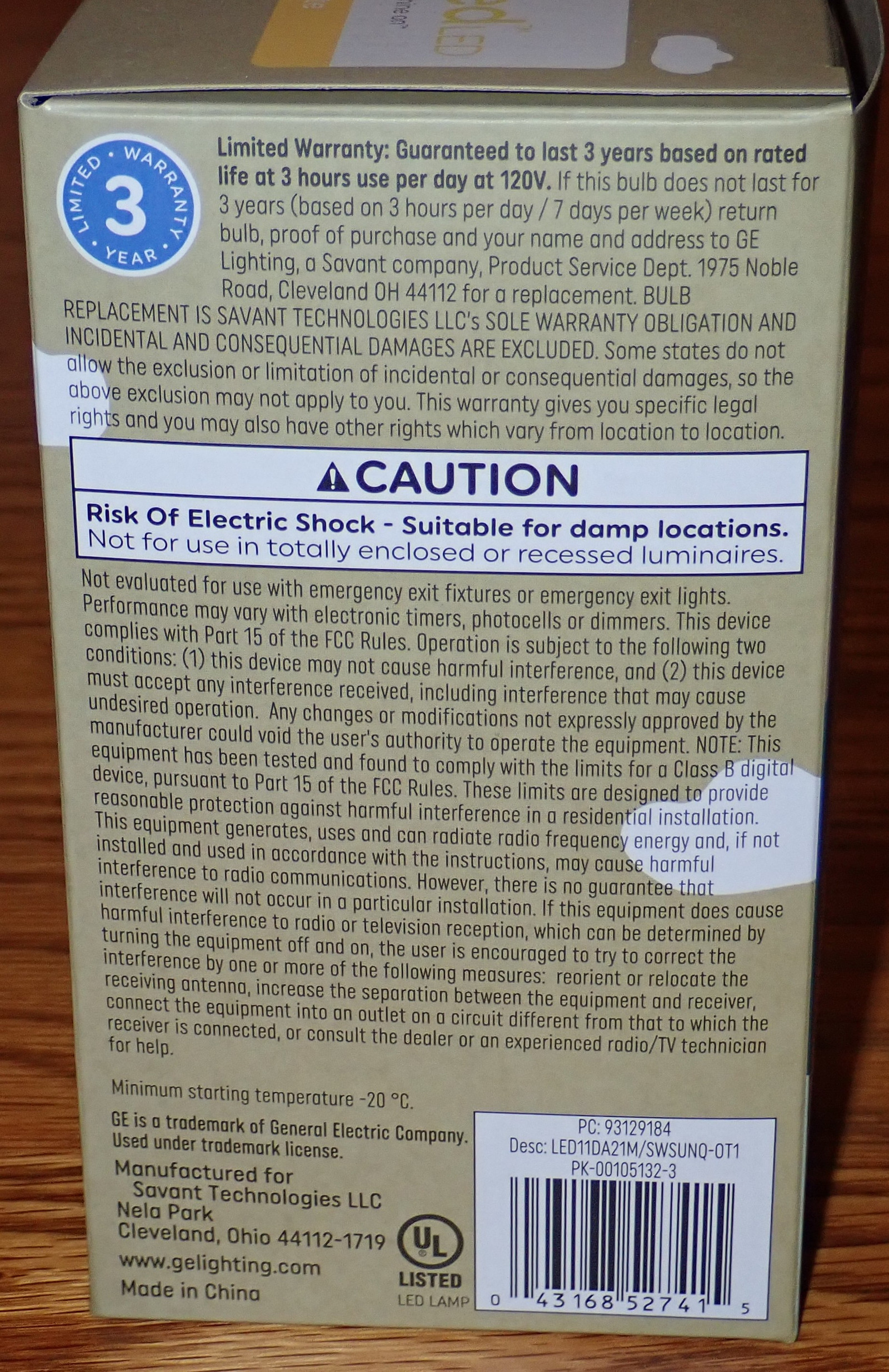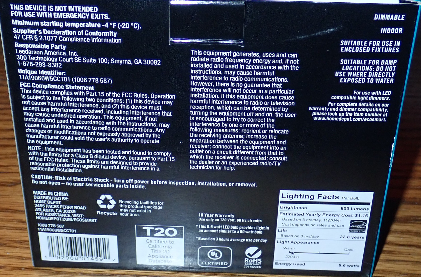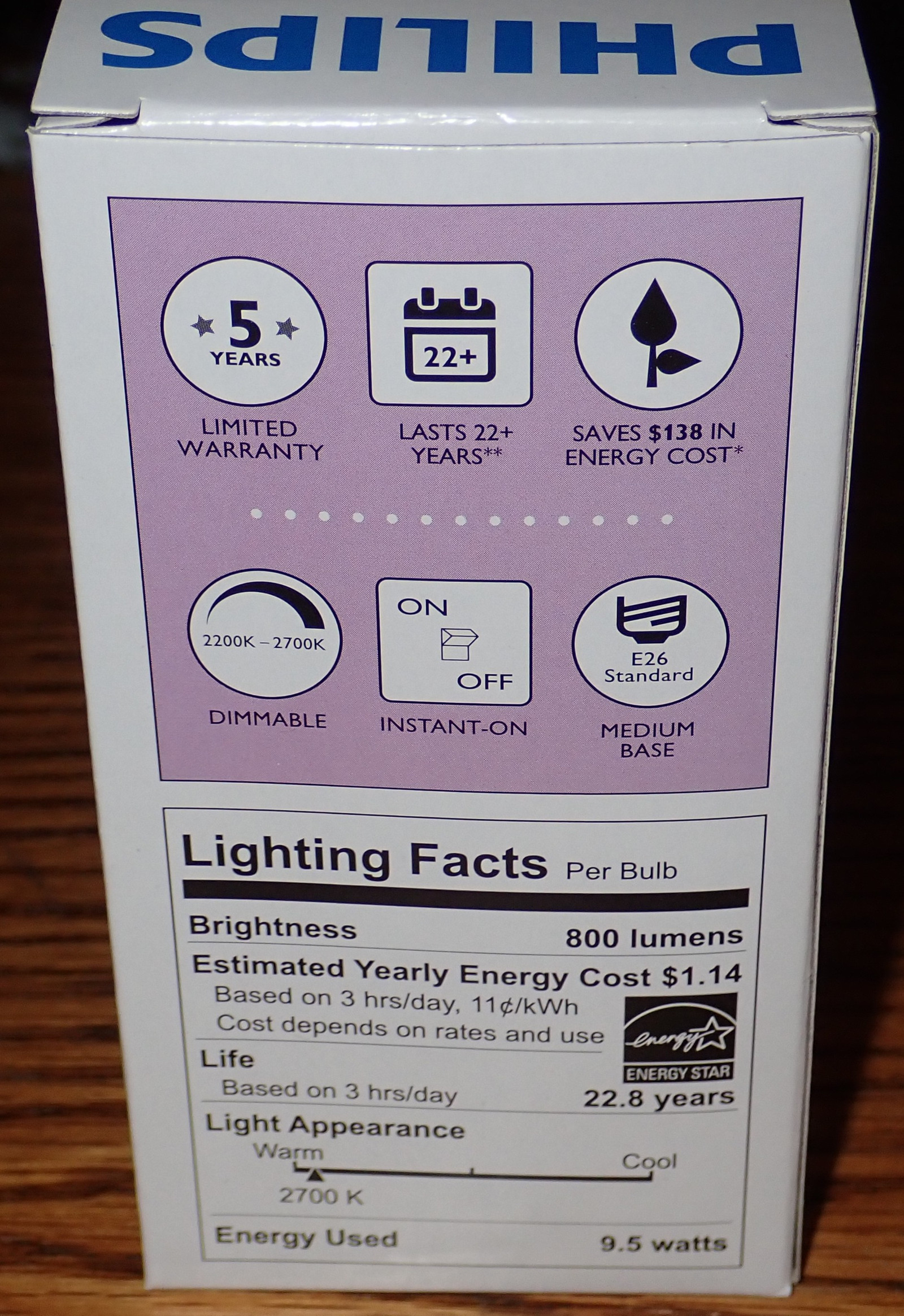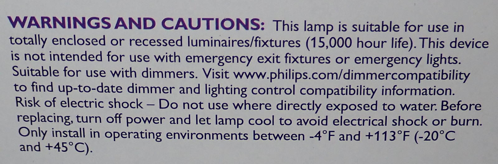 And, finally, the rather awful 3 year warranty (3 hours per day at 3 years is barely over 3000 hours) that requires proof of purchase (do you keep all your light bulb receipts?). That’s not encouraging. As is pretty typical, the bulb isn’t suited for use in totally enclosed or recessed light fixtures, which means you can’t use it in most of the lighting that modern homes are set up with (or, you can, but you’ll void the warranty and cook it to an early death).
