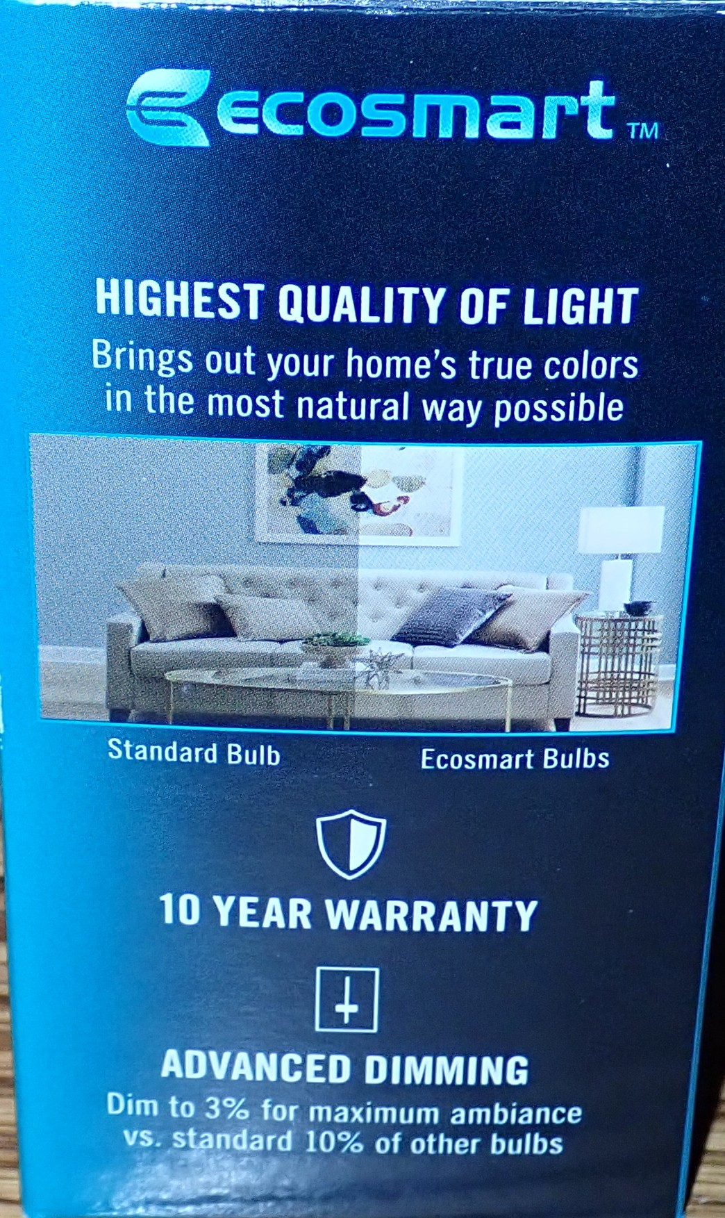 Moving on, the Ecosmart “standard” bulbs with the toggle switches. You’ll notice that these lack the nice DuoBright feature from the previous bulb. They’re just boring old bulbs with the switch on the side to toggle the color temperature.