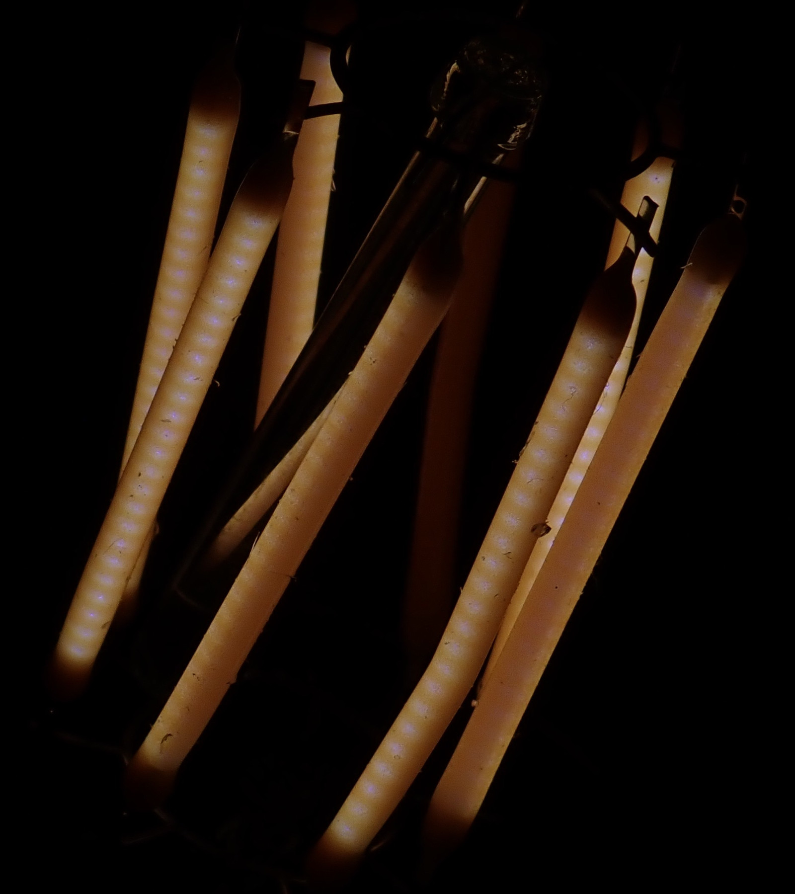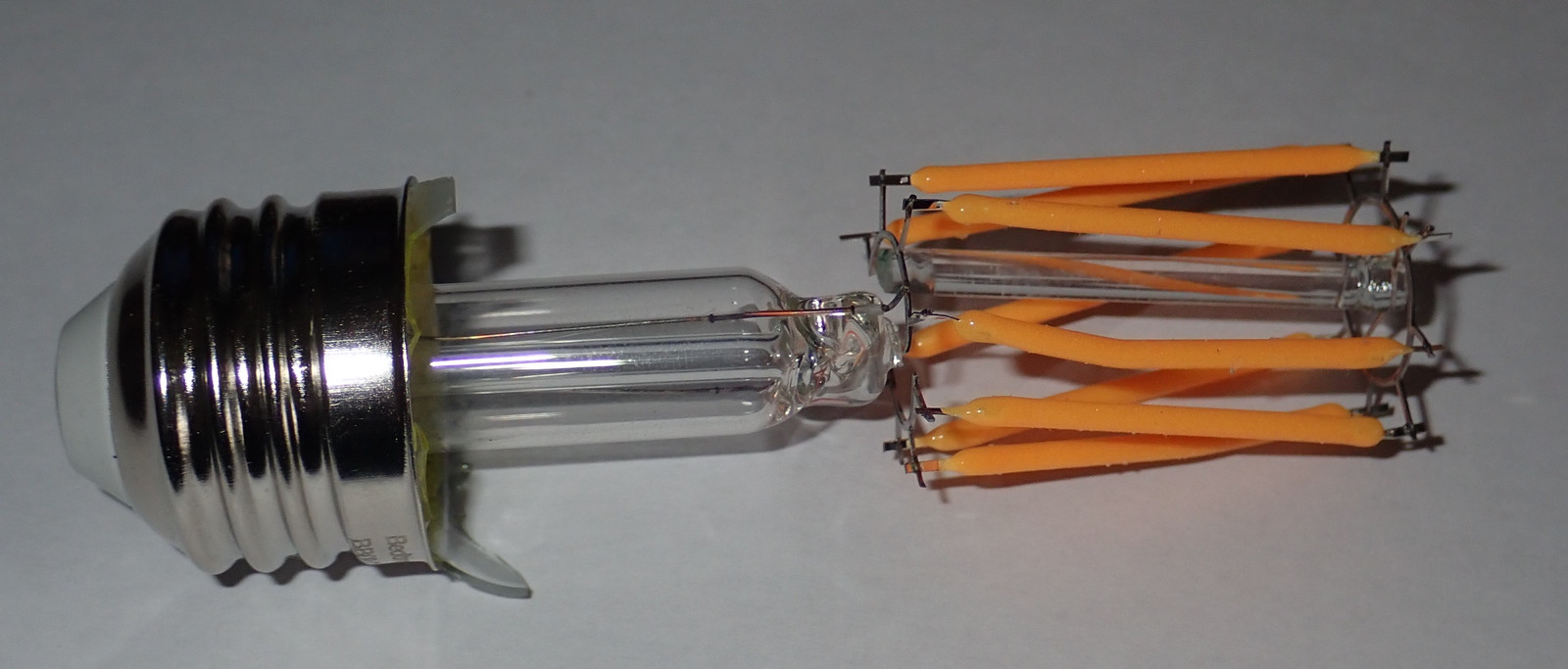 Playing with exposure, though, you can see that each of the strings is a whole bunch of LED emitters, presumably wrapped in a thick phosphor layer that helps keep flicker down. I’m really not exactly sure how this type of LED works in detail, but they’re quite common in the “artistic” bulbs for sale.