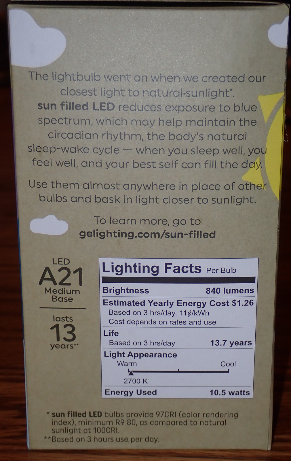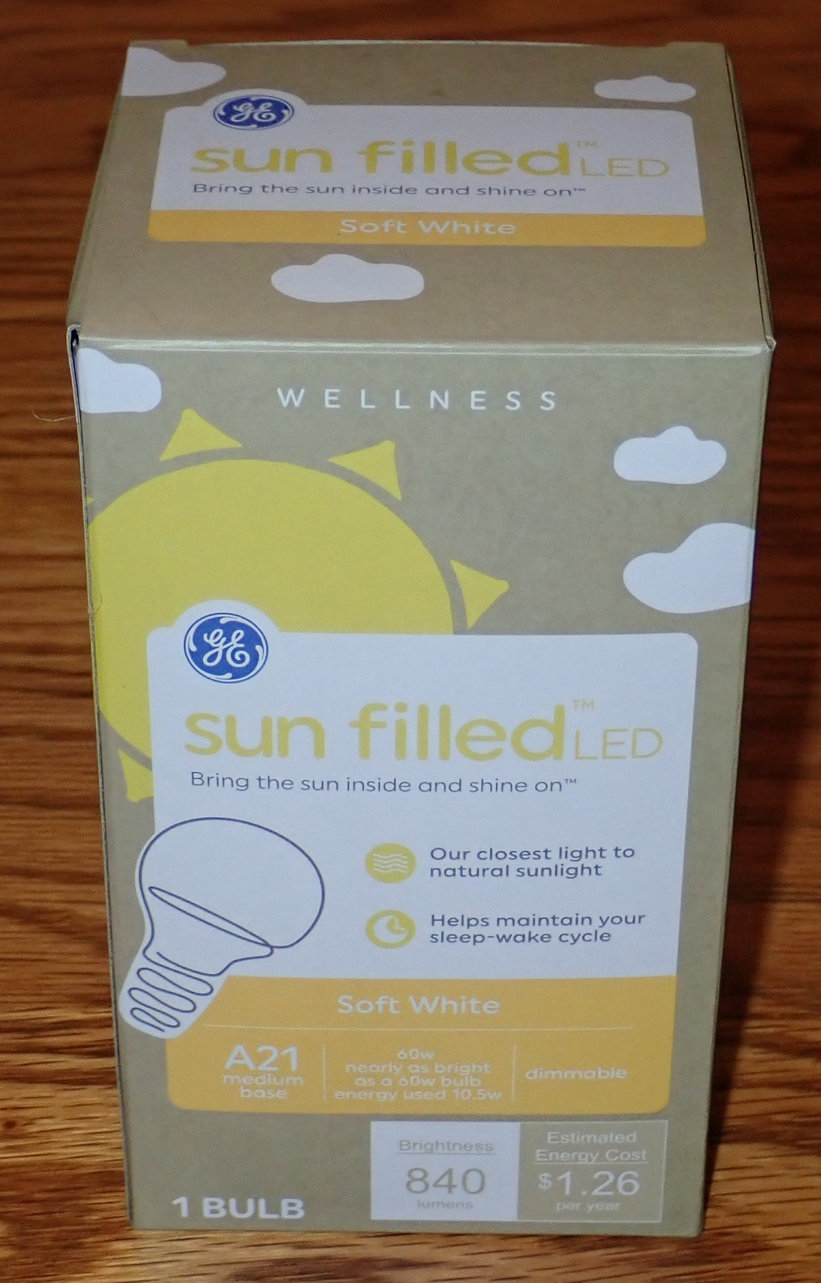Another recent “high end LED” bulb is GE’s Sun Filled brand (Amazon) (eBay). They claim all sorts of interesting things, and I picked up a Soft White version (2700K) at my local grocery store for far too much money (these are $10+ bulbs).