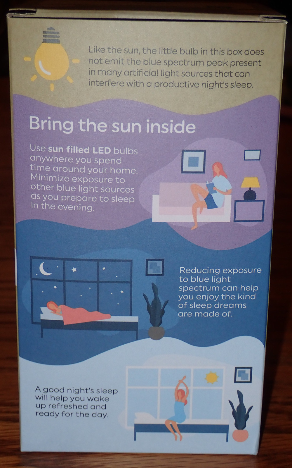 The side makes a variety of claims about the bulb - which I’ll look at below. LessBlue at least seems to imply it should be quite low in the blue emissions that convince the human body it’s daytime and you should stay awake. Vivid colors implies a high CRI (they claim 95), and it shouldn’t be flickering.