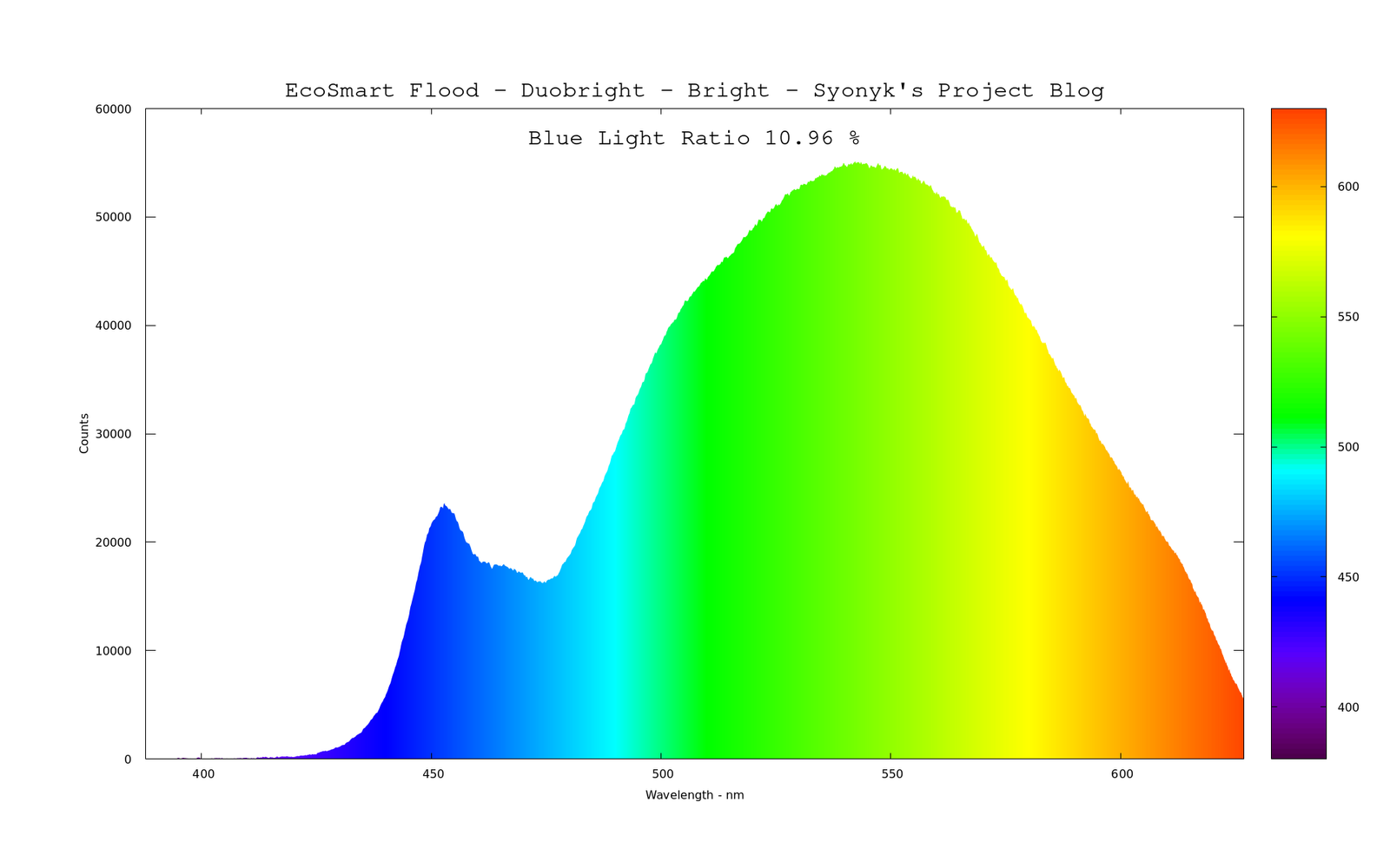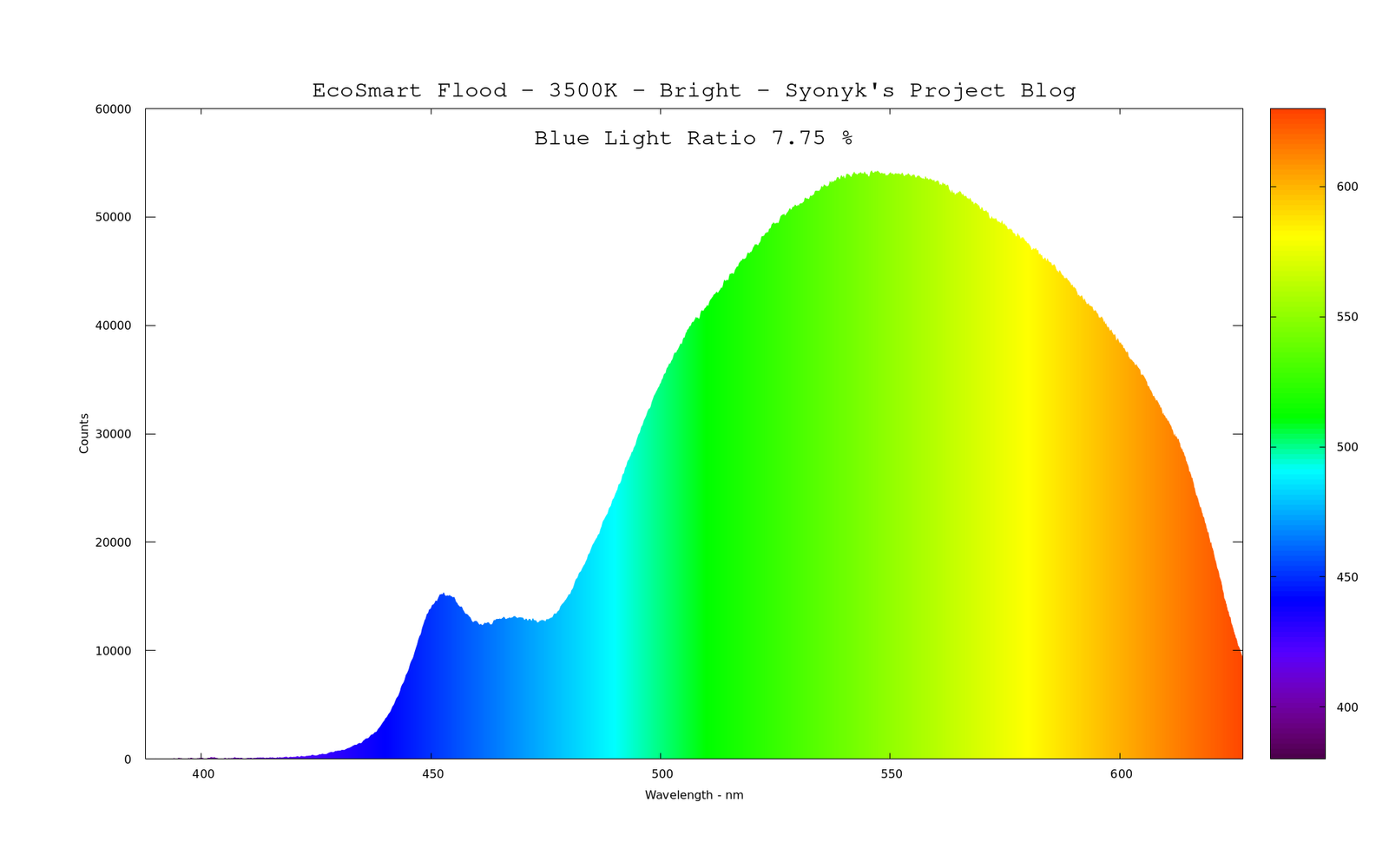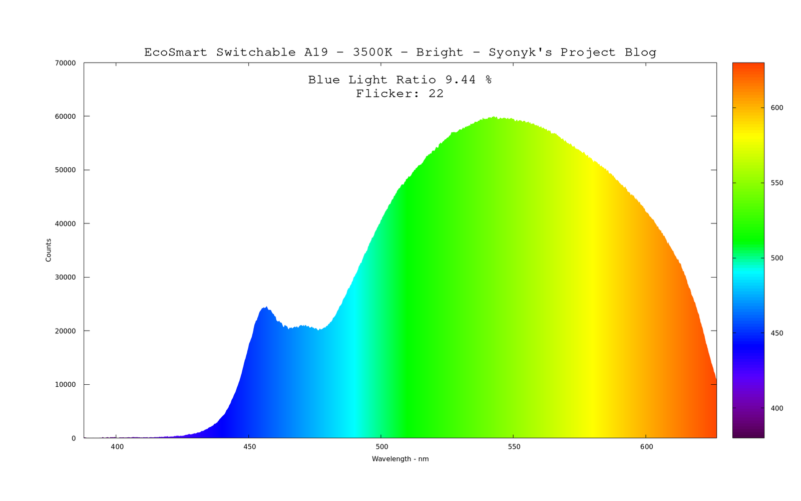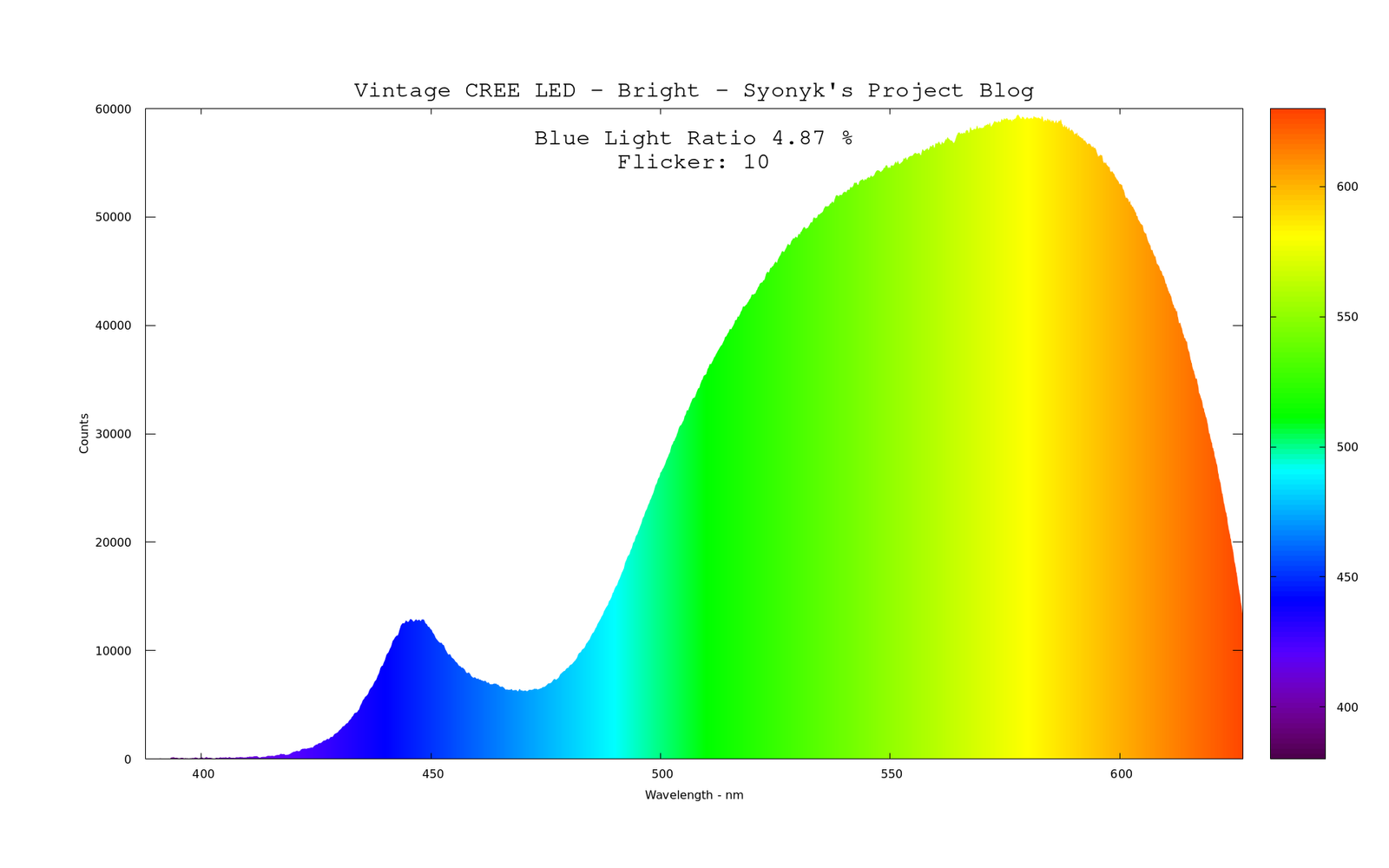 How are they? Well… they’re running a higher frequency (lower wavelength) blue emitter than most of the modern bulbs - and there’s that bit of a gap between the blue peak and the rest of the spectrum that happens to be more or less where humans are sensitive to blue. Do the math with the human sensitivity, and it’s somewhat lower in “human sleep impact blue” than a lot of the more modern bulbs. Again, it’s got a nice fat spread for the rest of the spectrum, though it’s tapering off earlier than I’d prefer in the reds.