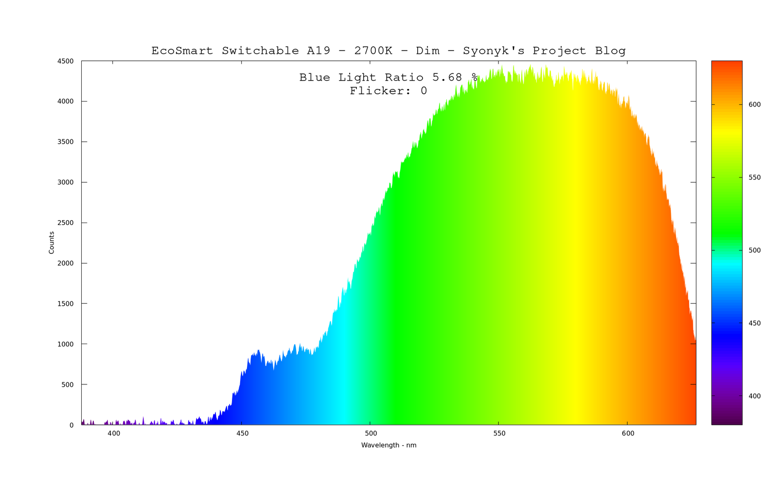 Dimmed, not much changes. There is a bit less blue, but it’s not particularly low blue in the region that impacts human sleep. I will say, it dims very well, which is nice - we’re sensitive to the absolute amount of blue in our light after dark, so being able to smoothly dim down deeply is nice to see. They’re certainly a nice LED, but they mostly replace the “blue peak” with a “fat blue region,” and the end result doesn’t seem particularly impressive to write home about as far as “low blue” goes. They are nice daytime use LEDs, though!