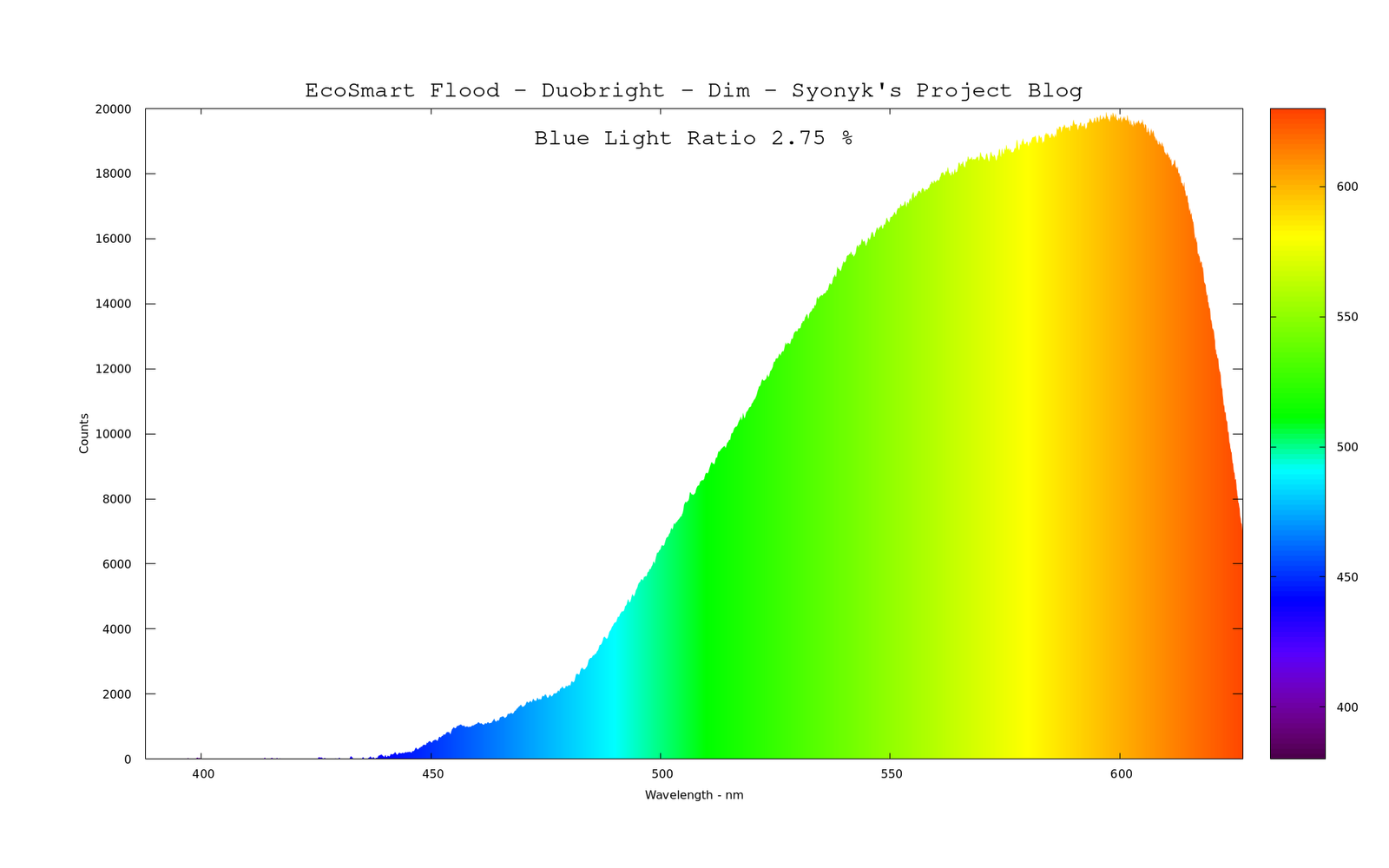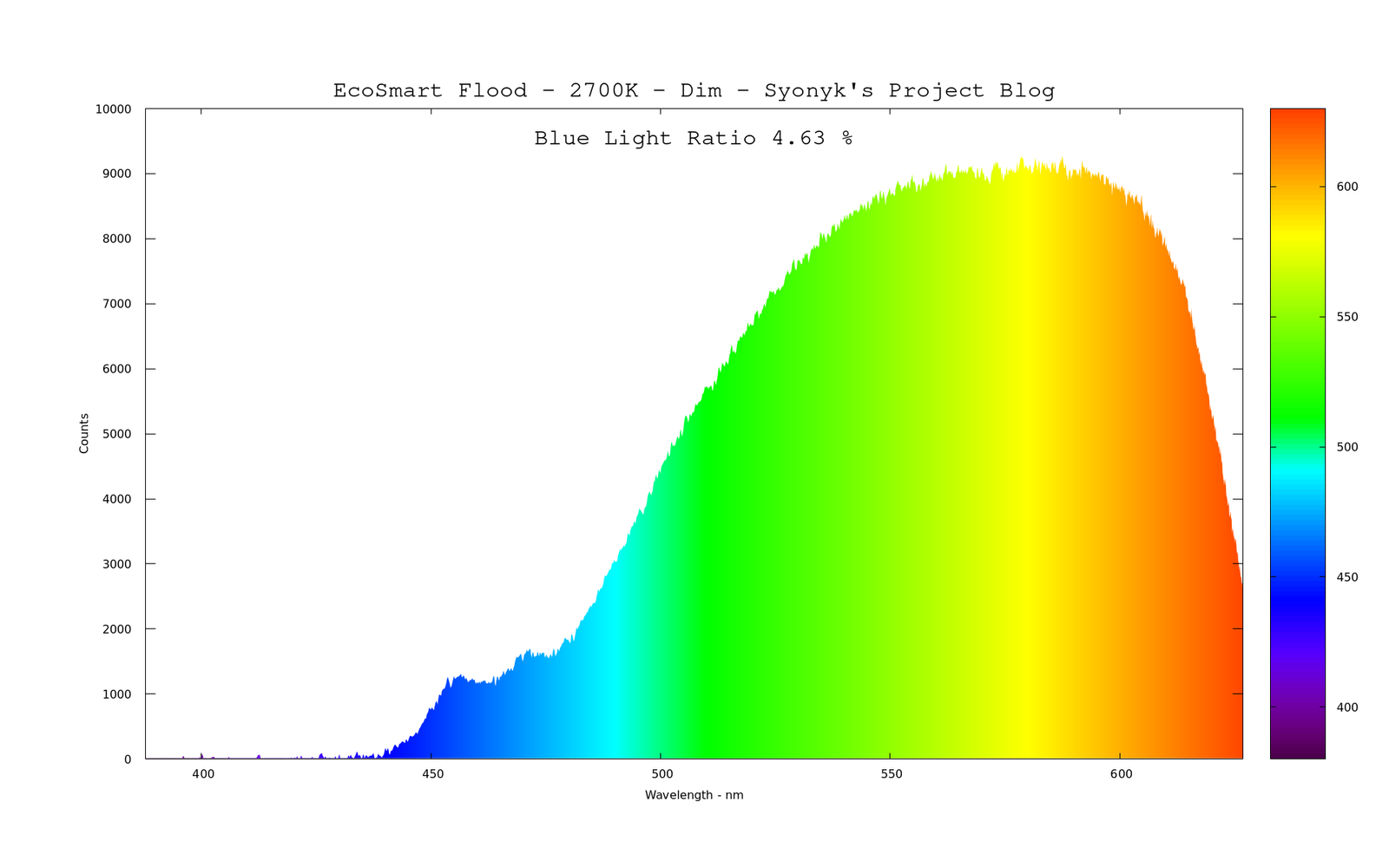 I believe the CRI numbers - the bulb does extend the spectrum further over into the reds fairly well. But in terms of low blue, I’m just not seeing that. It’s really no better or worse, down in the blues, than most of the 2700K bulbs. It’s still leaking an awful lot of blue in my terms, and I’m not sure that it’s really going to be much better than other bulbs at night (beyond being dimmer). It’s a great demonstration that “What it looks like” in terms of the color doesn’t really show you what’s going on with the blues. The bulb would greatly benefit from being a bit of an amber tint that helps knock out more of the light below 500nm or so.