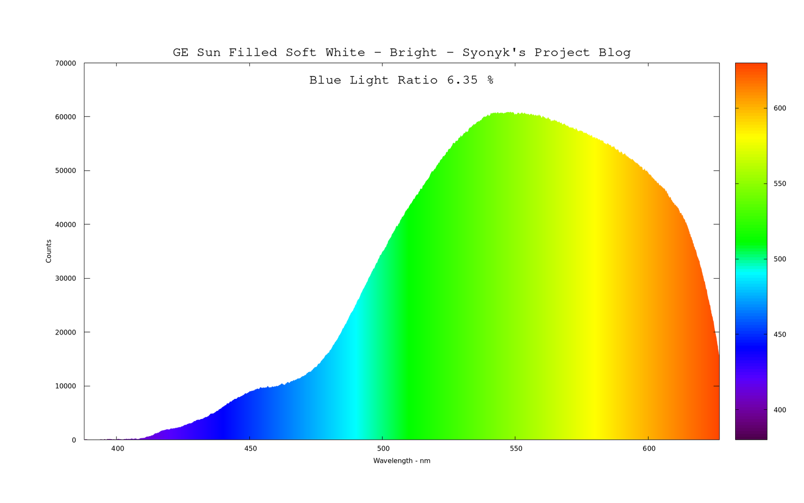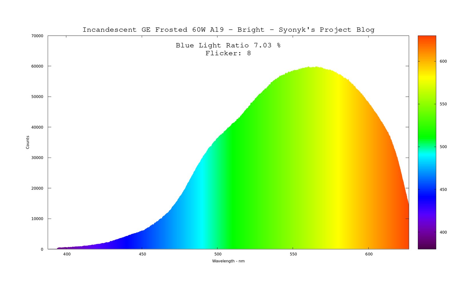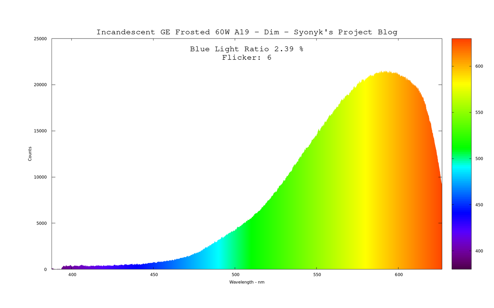 All of this is interesting, but the reason I started this is to compare LEDs to incandescents where it matters - because I’ve heard the claim made that “Well, sure, LEDs have a blue peak, but they’re still less-blue than any incandescent!” - with the implication that LEDs are better in the evening than incandescents. So, what’s an incandescent bulb spectrum look like?