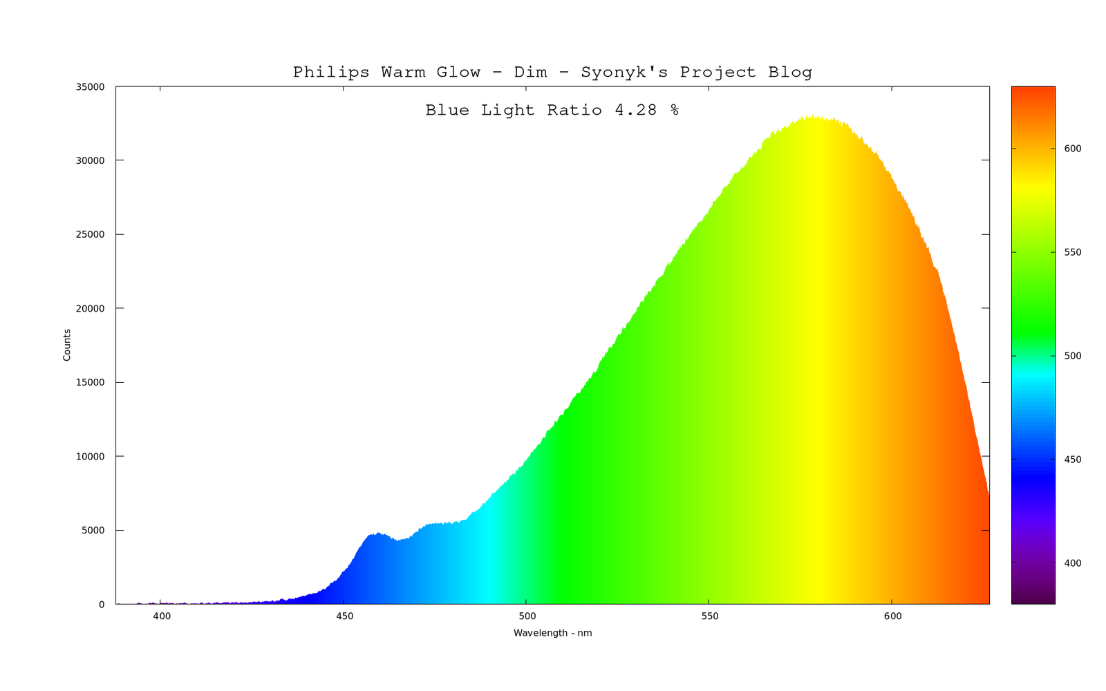 Dim it, the blue peak shifts right up into that 460nm range, you get only slightly less blue impact, and the spectrum peak shifts over slightly. It’s definitely redder visually, but in terms of an actual impact on blue light at night, it’s not particularly impressive in my book. Sad, really, because they do look good while they do it!