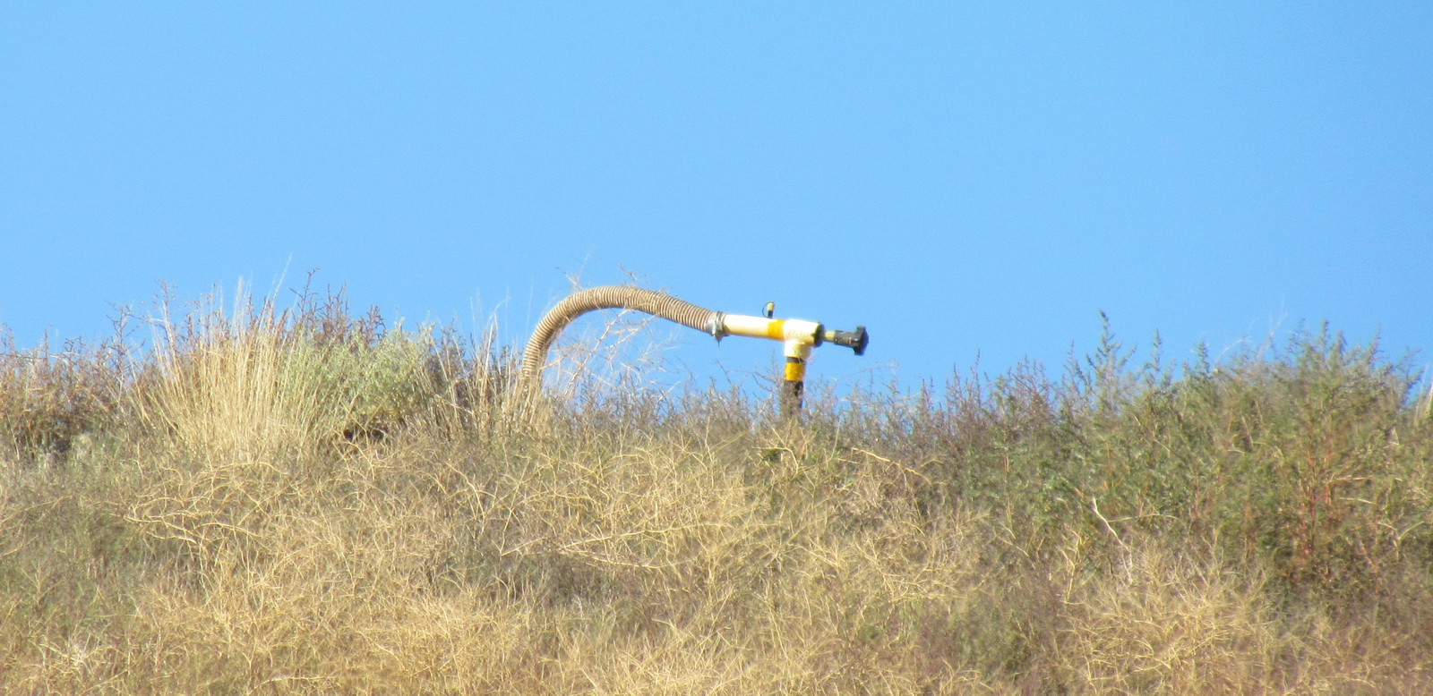I like my zoom lens. See that thing just to the left of the peak in the previous image? It’s a well head that looks exactly like this. Throughout the old landfill are 371 extraction wells, up to 200 feet deep. These provide a path for the landfill gasses (methane, carbon dioxide, nitrogen, hydrogen sulfide, and scattered other trace gasses) to escape into a collection system for later processing and use.