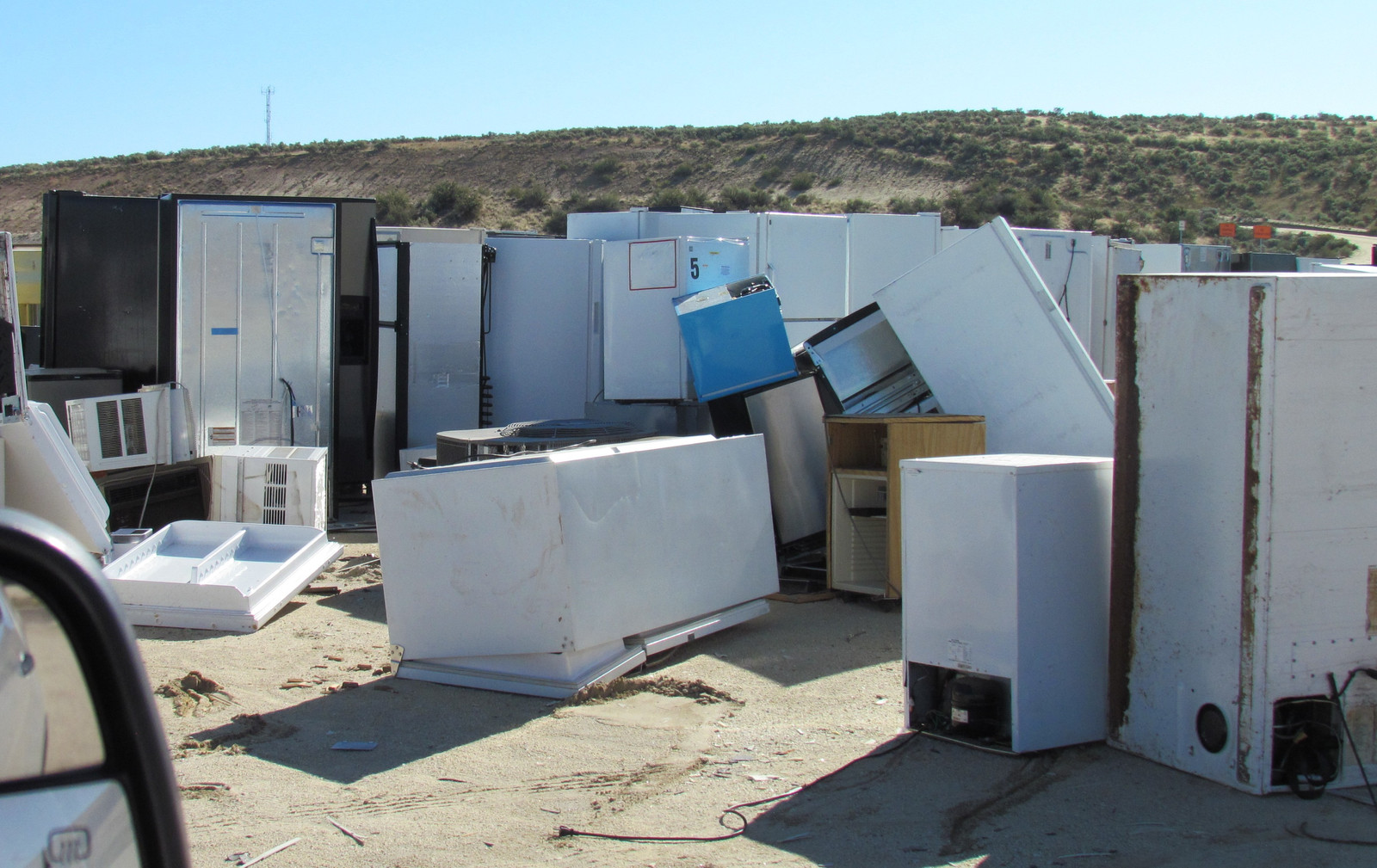 “Refrigeration equipment” (with some sort of refrigerant that should be recovered) is stacked in another area - mostly fridges, freezers, and window air conditioners. These are processed somewhere to safely extract the refrigerant before they’re recycled as metal scrap.