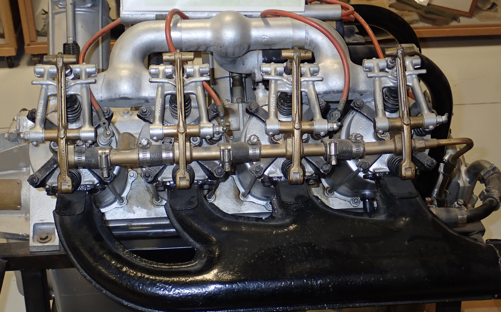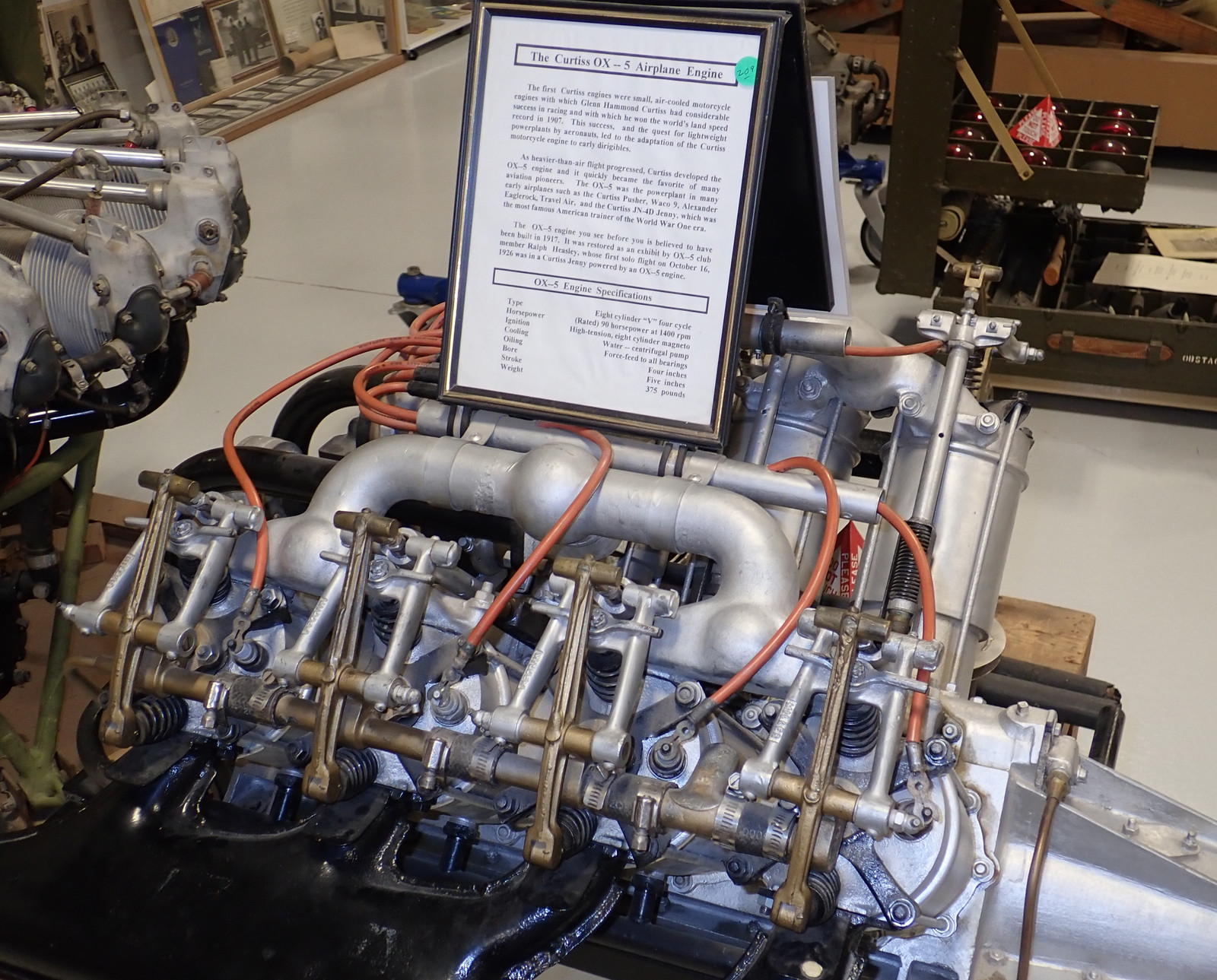 Going into the full sized engines, this is a Curtiss OX-5 - an early 1900s water cooled four stroke V-8 aviation engine, making roughly 90hp. The early engines (for both aircraft and cars) had external valve gear - a valve cover wasn’t a thing yet. This made for easy maintenance, but it also meant that the engine (and everything else around it) tended to get rather dirty, rather quickly. If you want more information, there’s an OX-5 club. with plenty of additional information. One interesting feature is the valve gear - it’s a combined pushrod for the exhaust valve and pull tube for the intake valve, nested inside each other. The bronze colored rocker arms are pushed up to open the exhaust valve, while the pi-shaped arms for the intake valve are pulled down.
