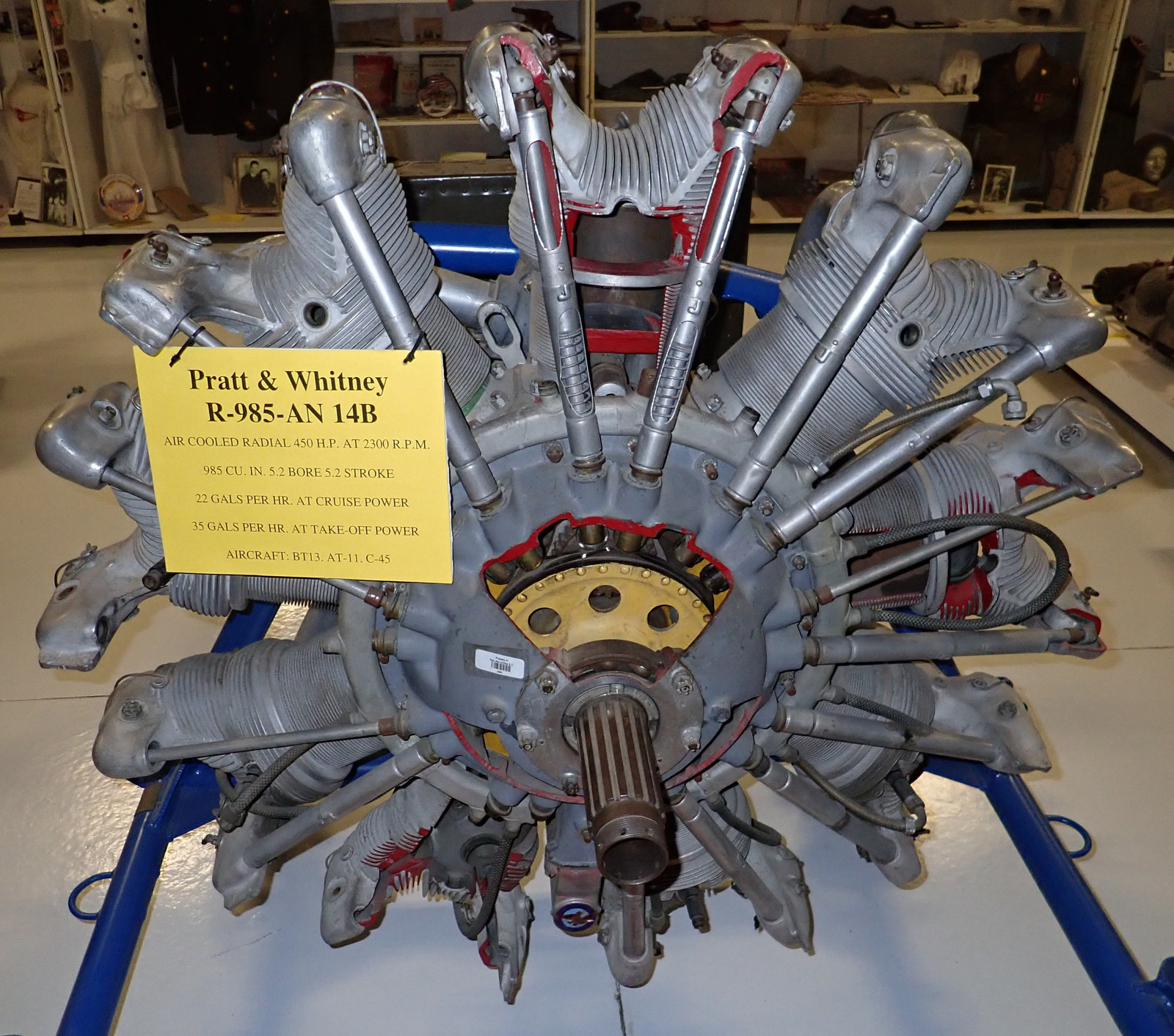 Moving forward a bit, people rapidly figured out that having the whole engine rotating was a bad idea, so the radial engines, while looking similar from the outside, had stationary cylinders in operation, simply rotating the crankshaft internally. This is a R-985-AN, also known as the Wasp Junior. It made 450hp, and was one of the bog standard radial engines of the early aviation age. By 1930, engines were fully enclosed in operation, with rocker covers and valve covers keeping all the bits and pieces inside a sealed environment, well splashed in oil.